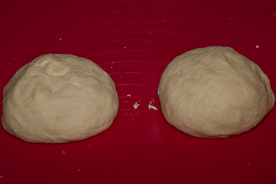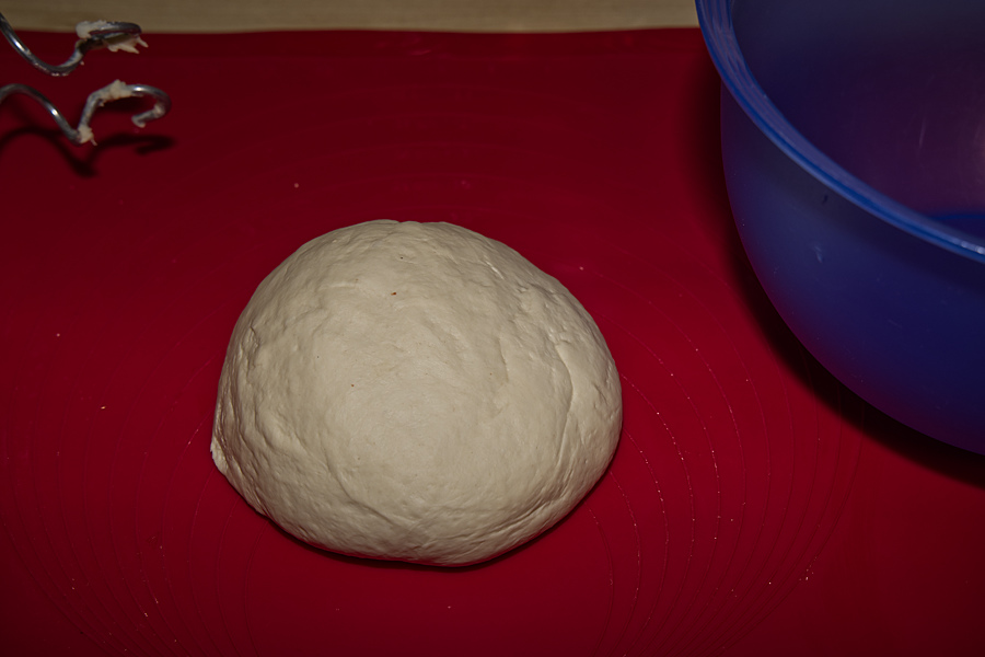 Die Hefe habe ich in warmes Wasser aufgelöst, Salz und Öl hinzugegeben und dann mit dem Mehl vermischt. Zunächst mit dem Knethaken des Mixers, später habe ich dann noch mit der Hand geknetet.