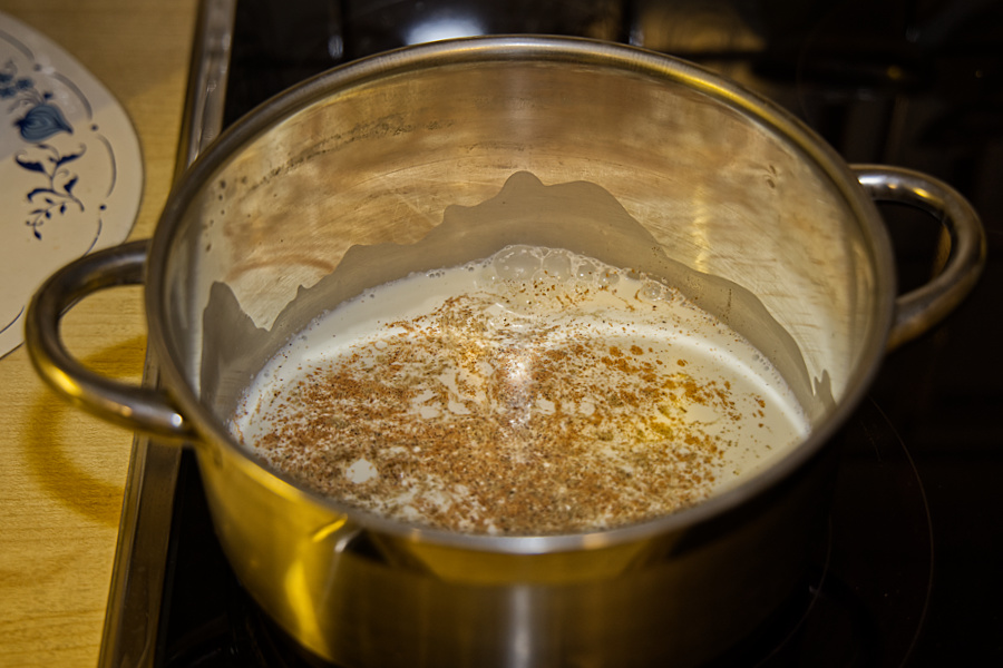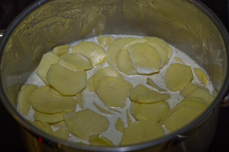 200 Gramm Sahne und 200 ml Milch mit etwas Salz Pfeffer und Muskat und 2 ausgedrückten Knoblauchzehen zusammen mit den Kartoffeln aufkochen und 10 Minuten auf kleiner Flamme weiterköcheln lassen. Man muss öfter umrühren, damit sich nichts ansetzt.