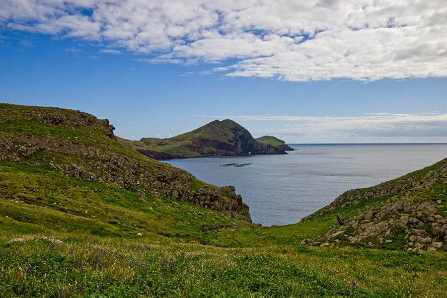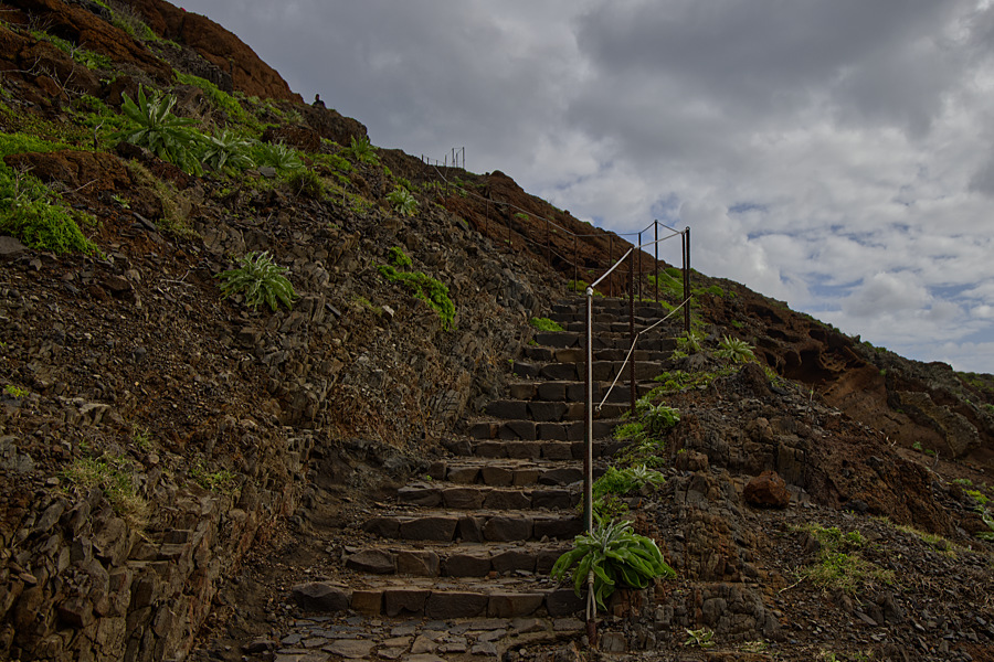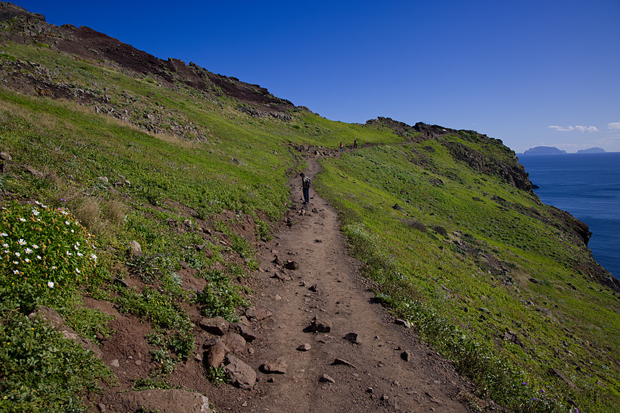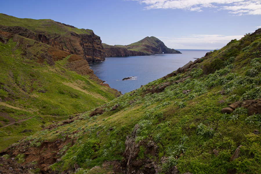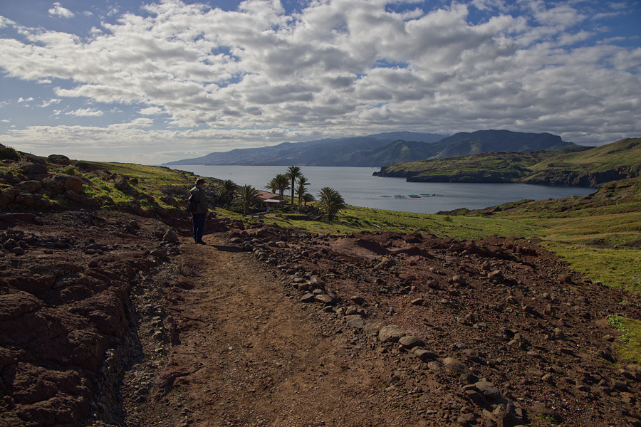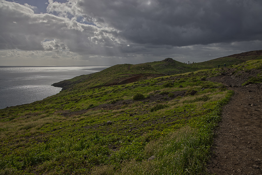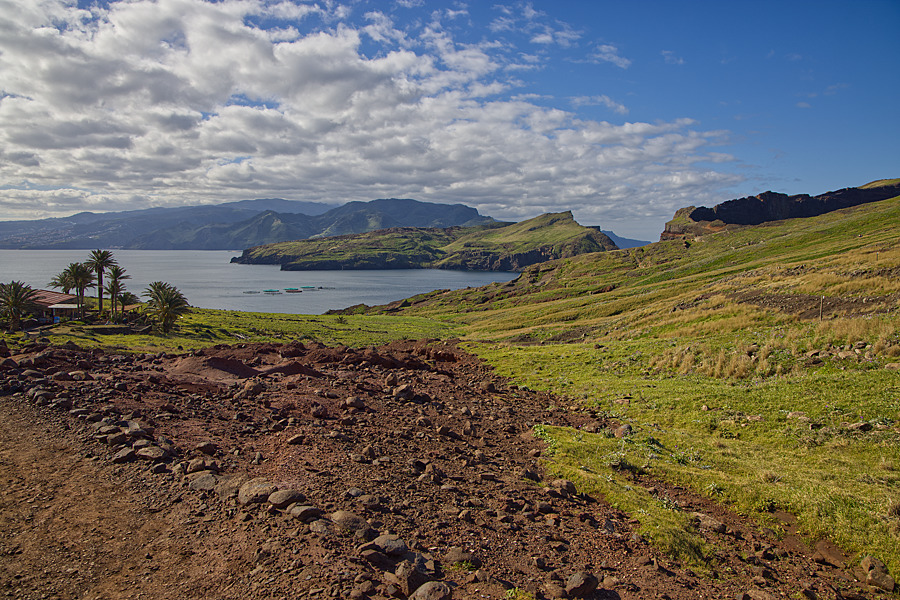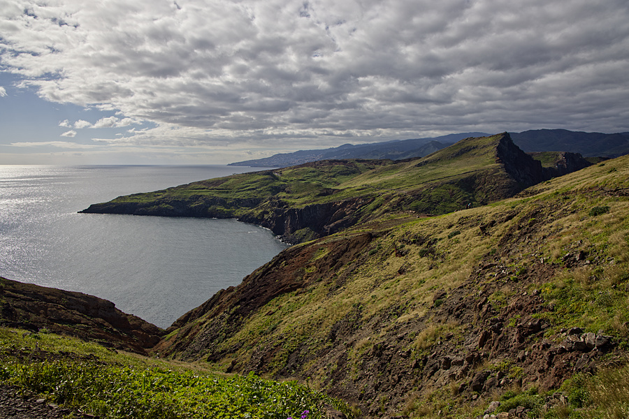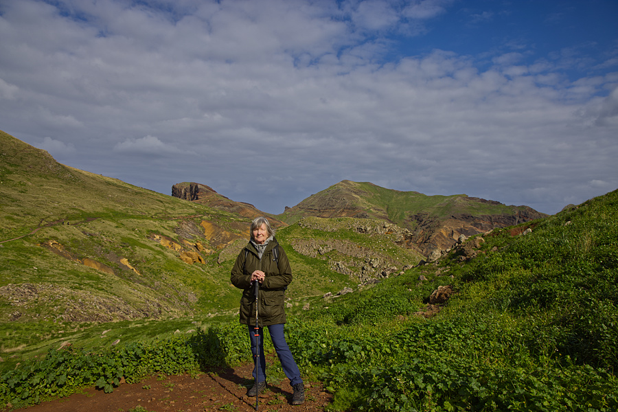 Wir gehen los, es geht rauf und runter, aber es ist gut zu bewältigen. Ich kann ja Pausen machen, wenn ich außer Atem komme. Da ich aber immer wieder neue Fotomotive sehe, kommen wir eh nur langsam voran. Es ist eine wunderschöne Gegend. Beim Anflug habe ich diese Halbinsel ja schon von oben gesehen und gestaunt.