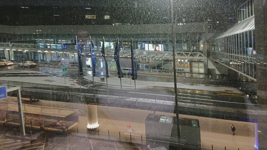 Kalt war es und zugig und wir mussten 22 Minuten auf den Anschlusszug zum Flughafen warten. Wie meinte der Schaffner bei der Kontrolle: ich komme mal in Ihr gemütliches Wohnzimmer, denn auf dieser Strecke sind die 1. Klasse -Kabinen sehr klein.