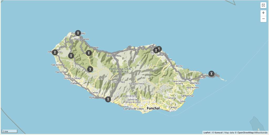 Bei komoot habe ich die einzelnen Ausflüge eingetragen, da kann man unsere Tagesrouten anschauen, soweit ich sie eingetragen habe. Man sieht, wir haben die Ecke um Funchal total ausgespart. Das haben wir bewusst gemacht, denn auf Großstadt standen wir hier zu dieser Corona-Zeit nicht.
