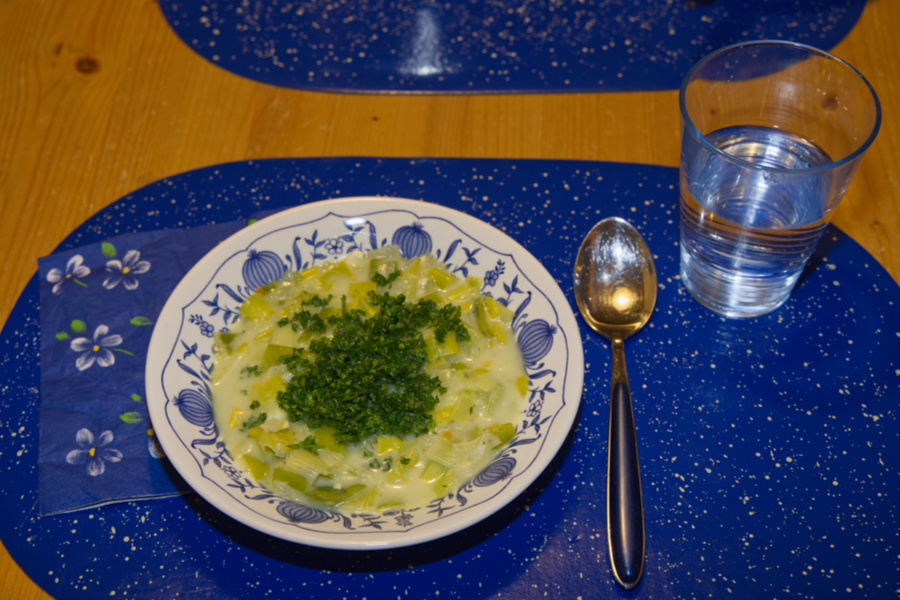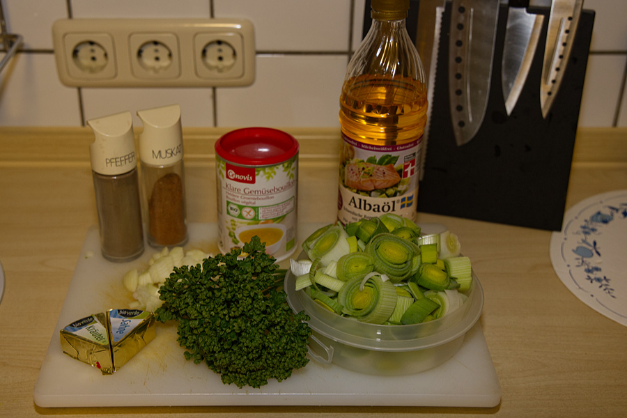 2 Stangen Porree, eine Zwiebel, 2 Käseecken, Gemüsebrühe, Salz Pfeffer und Petersilie