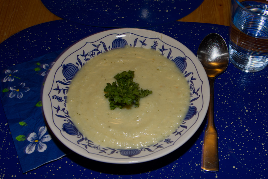 Ich hatte mir gestern einen Blumenkohl gekauft, viel zu groß für eine Person, leider veträgt Friedrich ihn nicht. Das letzte Rezept für eine Blumenkohlsuppe, welches ich hier eingestellt habe, war sehr gehaltvoll. Daher habe ich jetzt die leichte Version probiert, Sie hat mir gut geschmeckt, die Hälfte habe ich eingefroren und ich habe immer noch einen halben Blumenkohl übrig, da überlege ich noch, was ich damit mache.