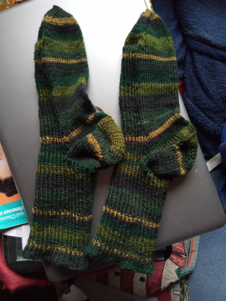 DIe nächsten Socken sind fertig - an diesem Wochenende gestrickt in Gr. 37 für eine Nichte - dieser hatte ich ein Tuch gestrickt und sie hat mir vor ein paar Tagen sehr nett geschrieben, wie oft sie sich drin einkuschelt, insbesondere in ihrer neuen Wohnung in einer Leseecke, die sie sich geschaffen hat. Der Boden ist kalt, also gibt es jetzt die passenden Socken dazu.