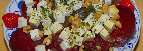 Rote Bete, Feta, Salat, Champignons, Walnüsse Erdbeeren mit einer Marinade aus Balsamico, Öl, Senf, Salz und Basilikum