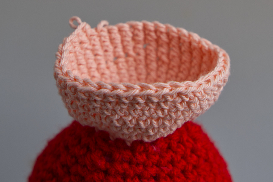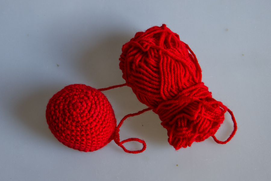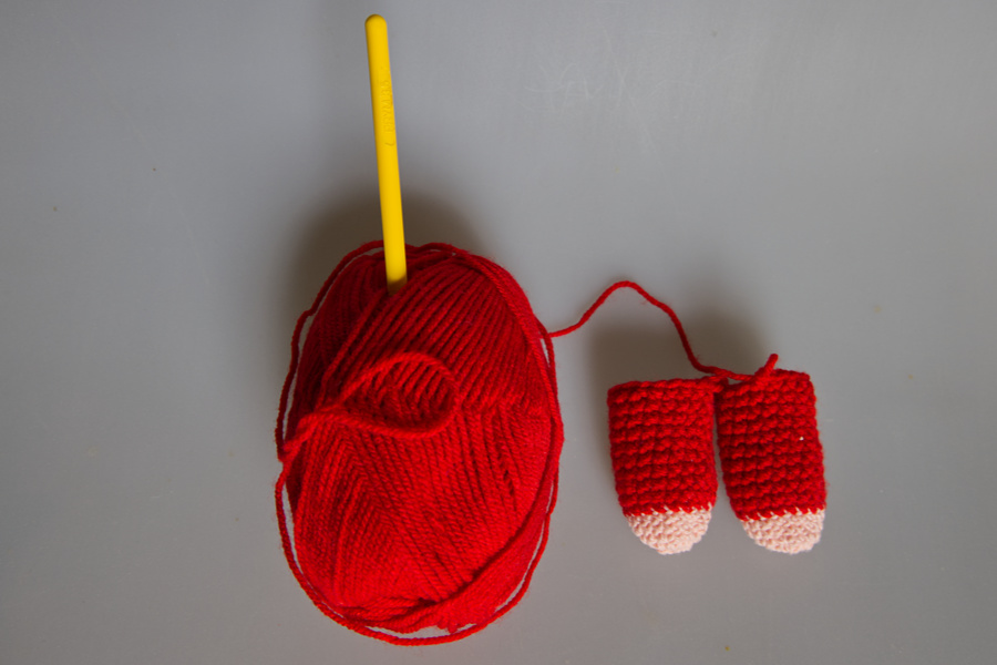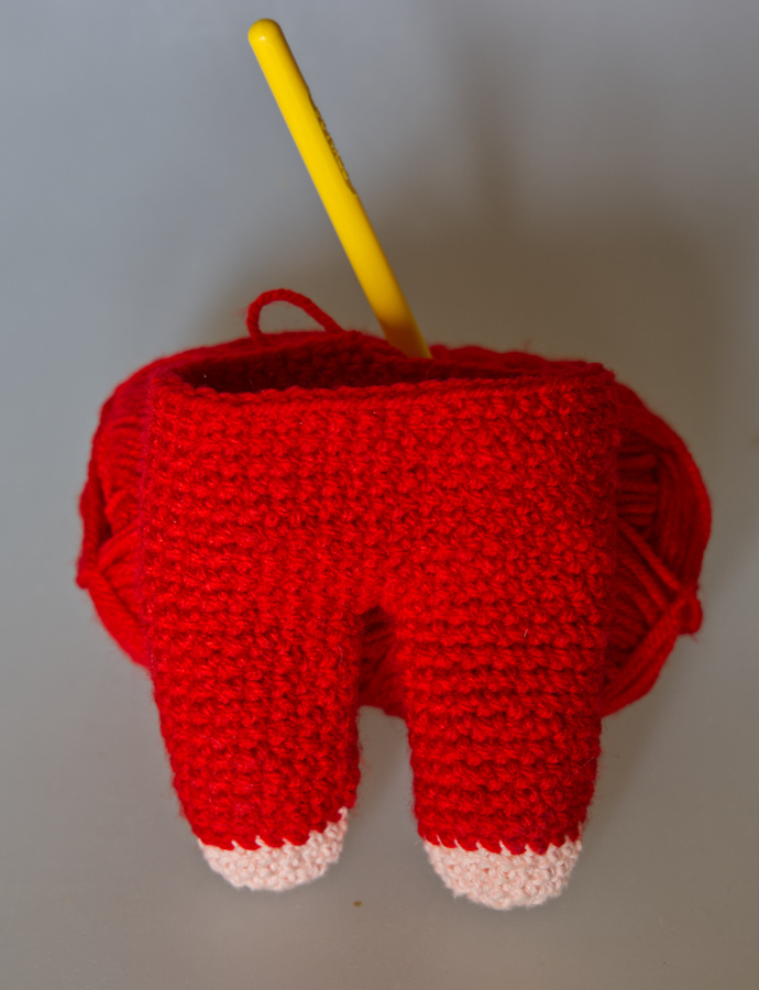 Man fängt mit 2 Luftmaschen an und häkelt dann 6 feste Maschen in die zweite Luftmasche und dann geht es immer rund.als erstes werden die beiden Beine gehäkelt. Ich habe die Farben rosa und rot genommen.
