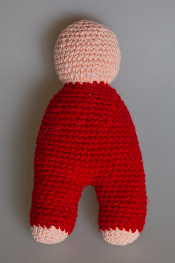 Nach 14 Runden habe ich die beiden Beine zusammengehäkelt und den Körper gestrickt, erst habe ich etwas zufenommen, das Baby soll ja gut genährt sein.