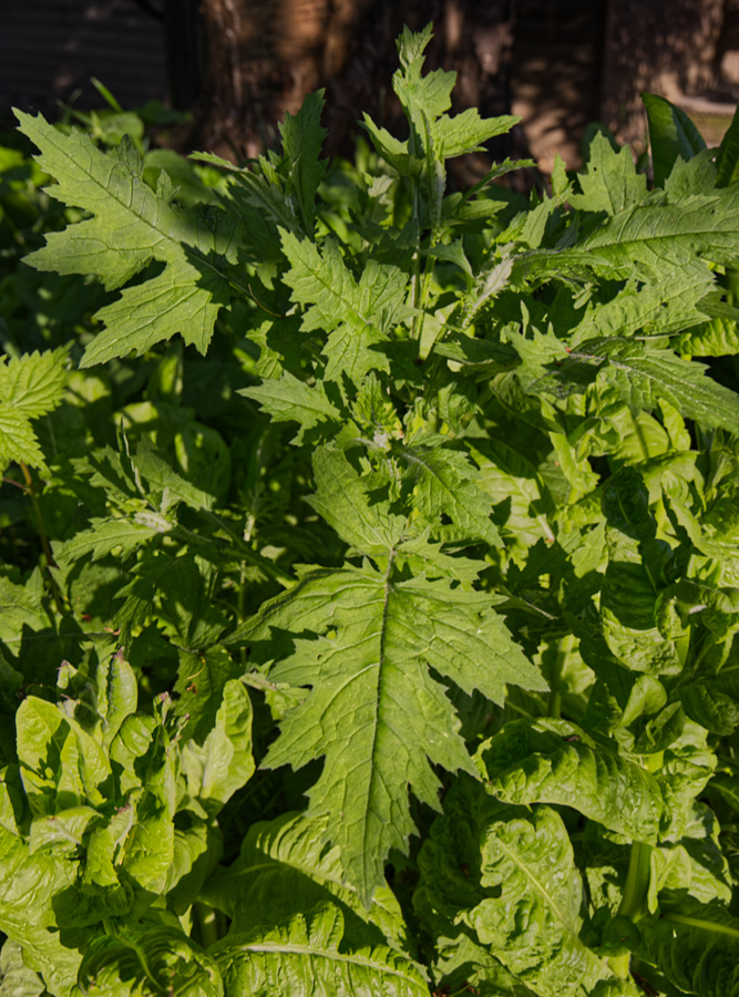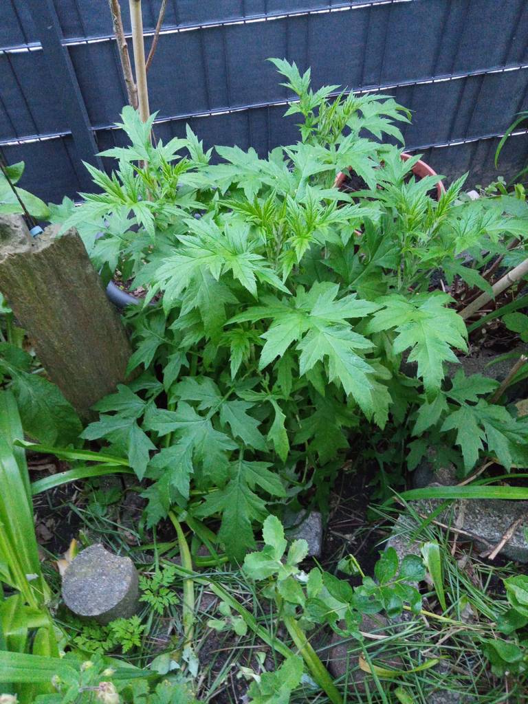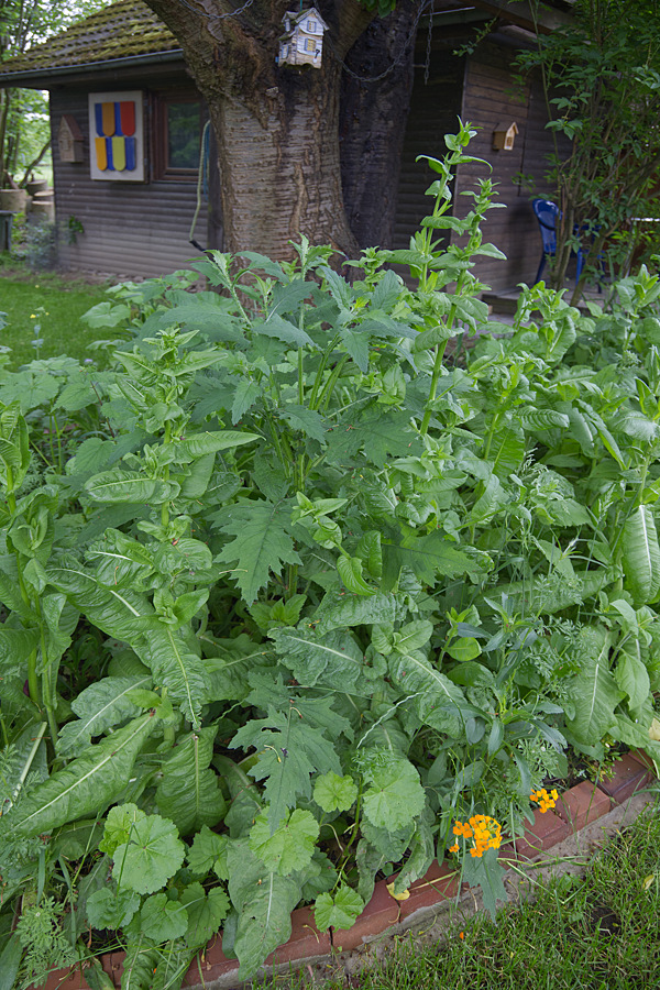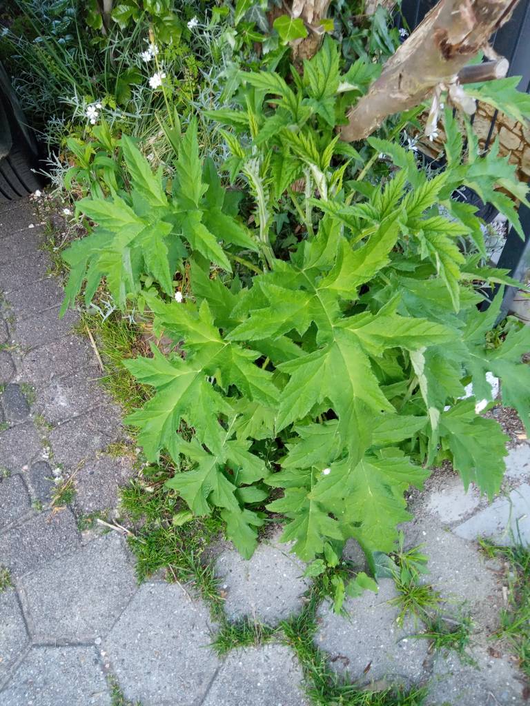 Ich habe vorhin mal die Pflanze fotografiert. Friedrich wird sich morgen Schutzkleidung anziehen und die Pflanze rausholen. Er muss ein ganzes Teil der Wurzel abstechen, damit die Pflanze nicht mehr austreiben kann. Natürlich kommt sie auch nicht auf den Kompost, sondern in den normalen Müll.