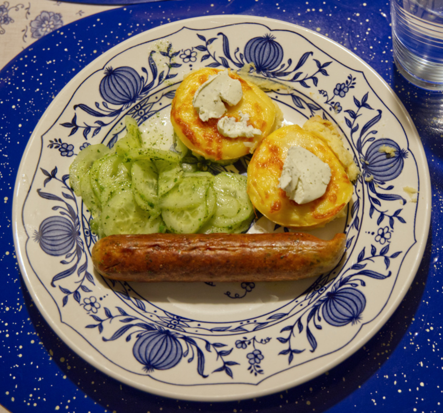 Kartoffel-Muffins, entweder mit selbstgemachten Kartoffelpüree oder aus der Tüte, dazu viel Käse, Eier und Knoblauch. Dazu gab es einen Klecks Kräuterquark, einen Gurkensalat und eine Veggie-Bratwurst.