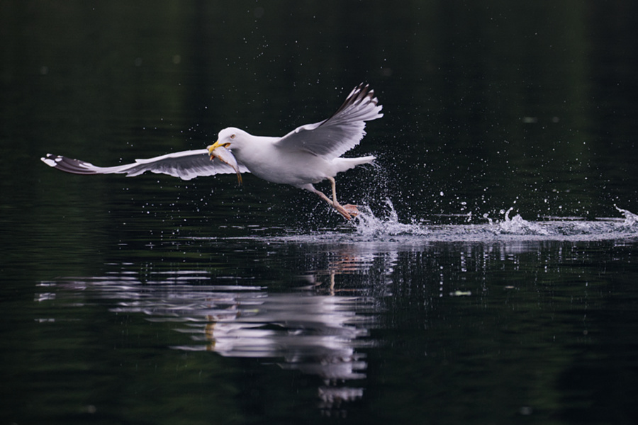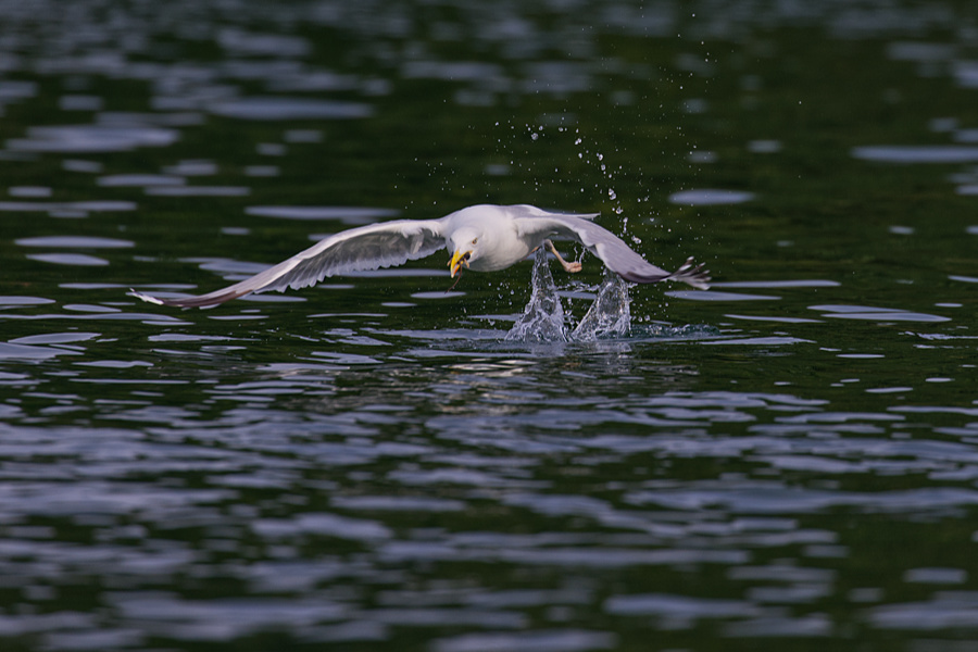 Manchmal ist es kein Fisch, sondern eine Maus, die aber ihr Leben schon ausgehaucht hat. Auch das ist für die Möwe kein Problem, sie schluckt ein paar Mal, zum Schluss guckt nur noch die Schwanzspitze raus und dann ist die Maus verschwunden.
