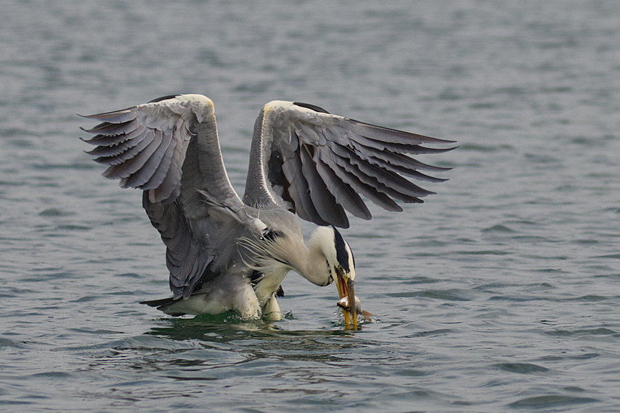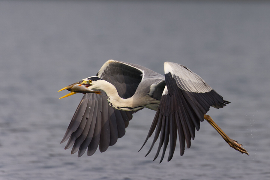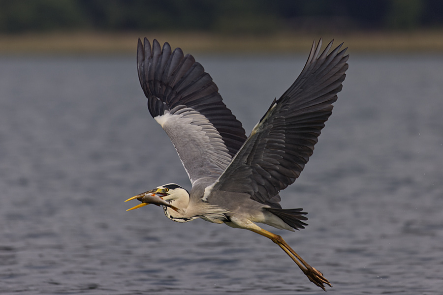 So langsam drehen wir um, auf einmal kommt ein Graureiher in Sicht. Ok meinte Fred, mal sehen, ob wir ihn anlocken können. Wir konnten! Wow, der Reiher flog etliche Male und holte sich seine Leckerbissen ab.