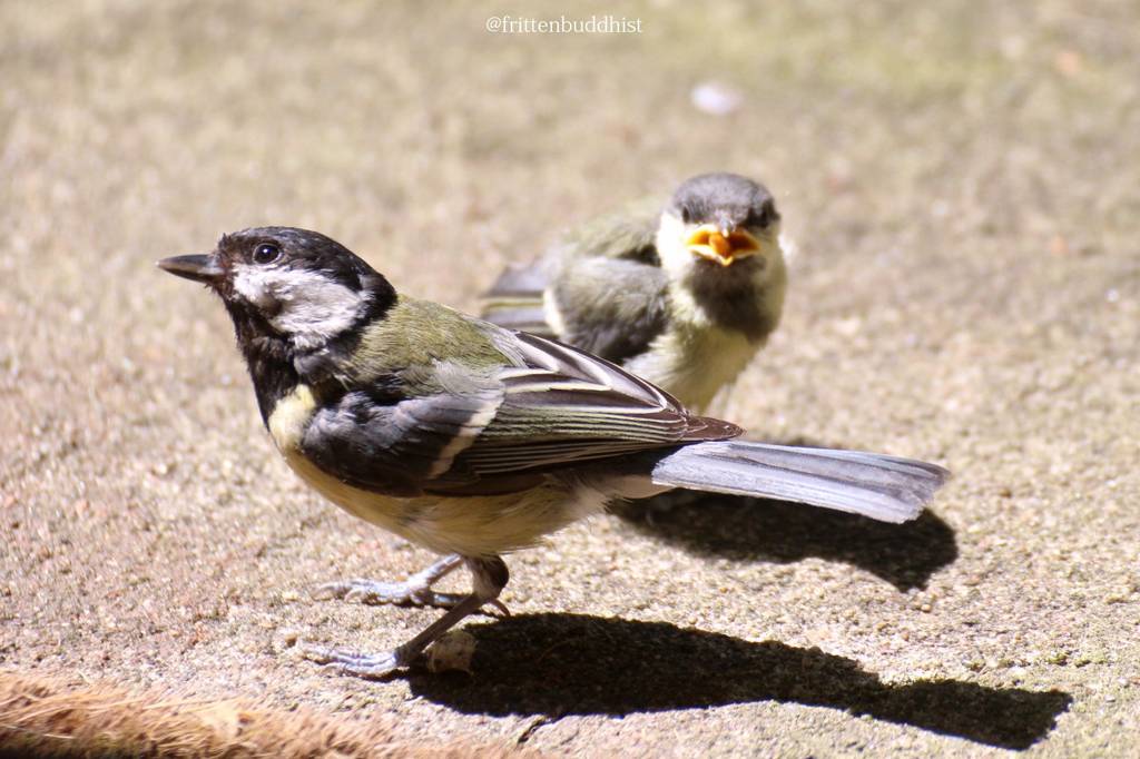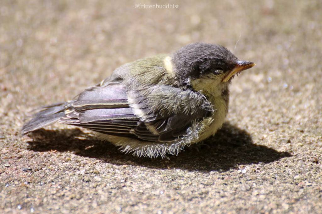Als ich sie nun auf dem Betonboden sitzend fand, machte ich mir ein bisschen Sorgen, weil sie völlig ungeschützt war und ich schon im letzten Jahr mitbekommen habe, dass die Eichelhäher ganz gerne mal eine junge Meise wegsnacken. Auch Elstern und Rabenkrähen hatte ich auf dem Zettel und natürlich die obligatorischen Katzen... es ist eine wirklich gefährliche Welt für eine junge noch nicht ganz flugfähige Meise. Wie gefährlich sie tatsächlich ist, sollte ich später noch sehr eindrucksvoll mitbekommen, aber dazu komme ich noch.