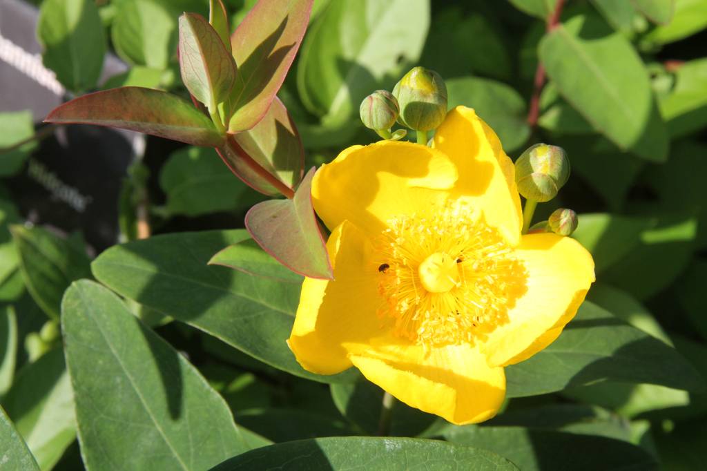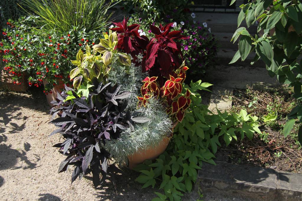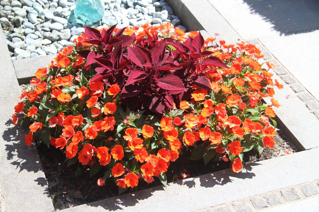 Ich habe 4 rot gelbe Pflanzen eingekauft und dieses Beet, in dem bereits die rotblättrigen Pflanzen lebten, neu gestaltet