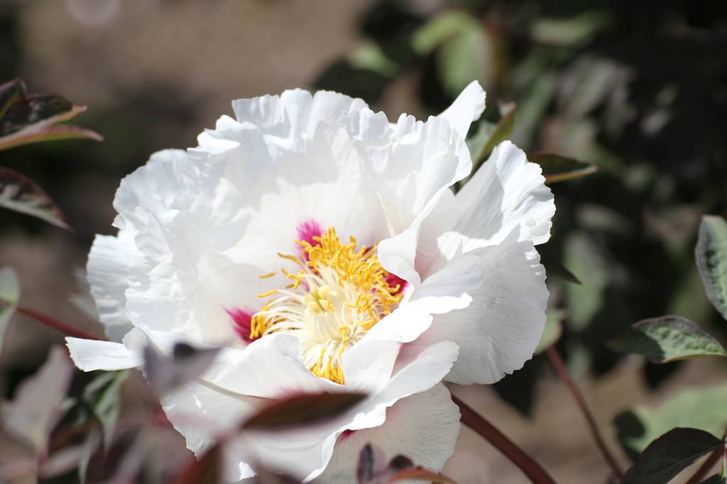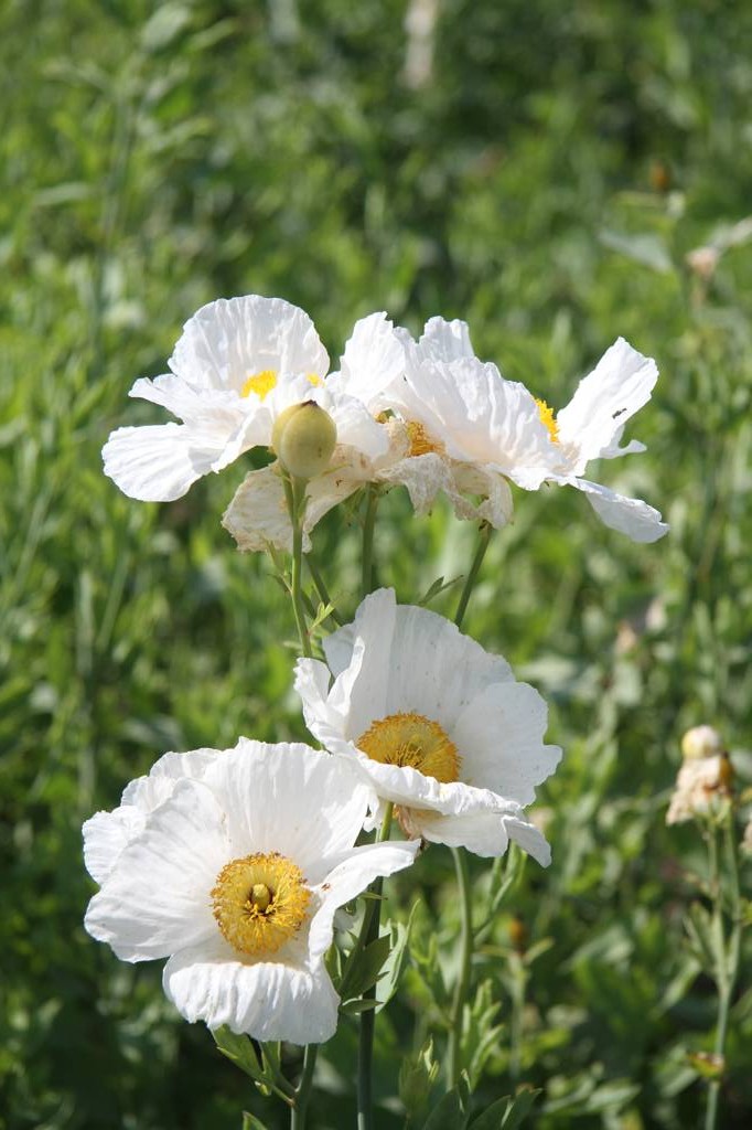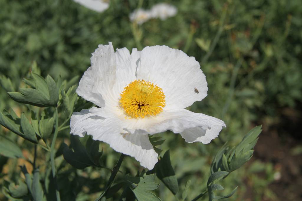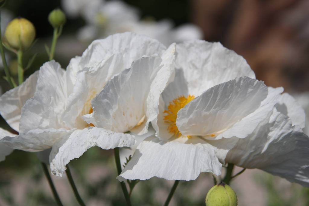 Vor dem Baum steht kalifornischer Strauchmohn - wunderschöne weiße riesige Blüten