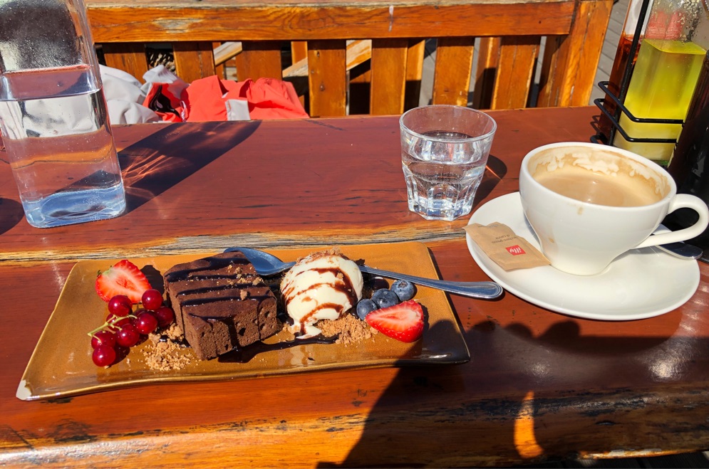Hier kommen auch die Fähren aus Dänemark an. Die Anfahrt war ätzend, es ging über einen hohen Pass und mitten rein in die dichte Wolkendecke. Konnte kaum was sehen beim Fahren. In dem Örtchen selber war dann wieder alles fein und sonnig. Da die Kiki ohne Frühstück aus dem Haus ging, stopfte sie sich hier erst einmal einen dicken Schokomuffin in den Bauch. Dazu 2 Kaffee, dann konnte es weiter gehen.