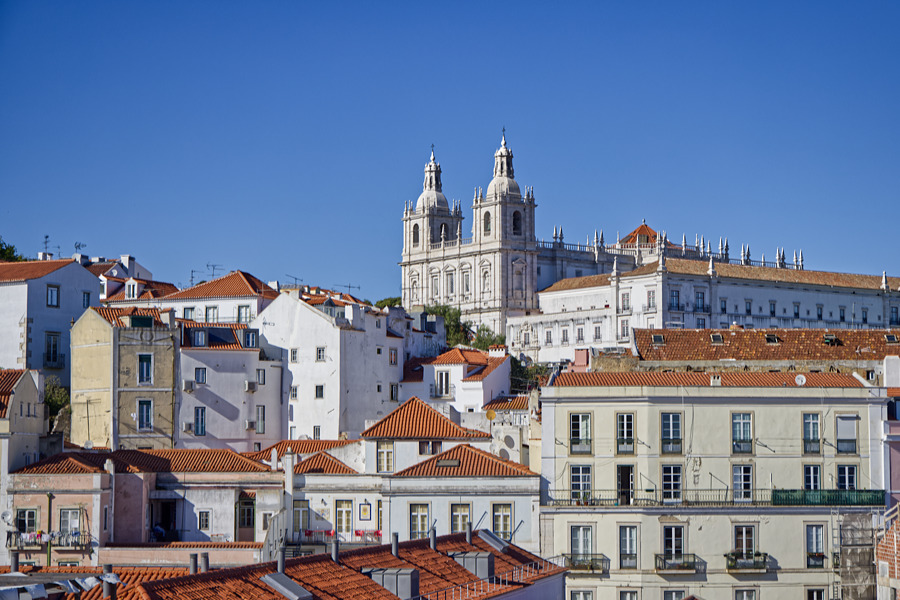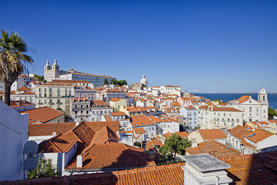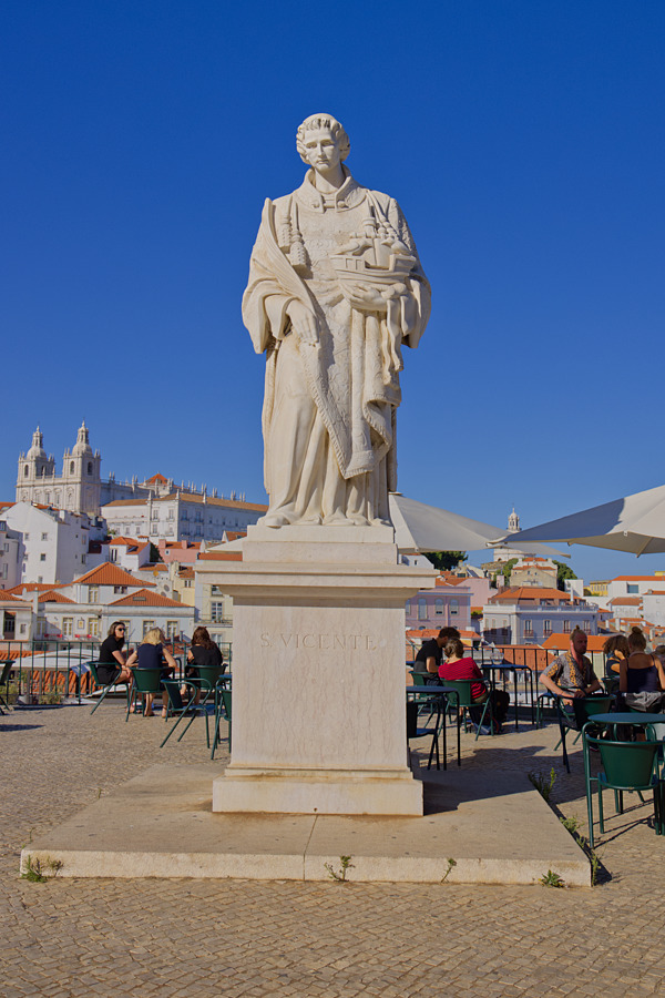 Genug auf der Burg gesehen liefen wir nun zum MIradouro Portas do Sol, dort kann man schön sitzen und wieder die Aussicht auf die Altstadt Alfama mit den vielen roten Dächern genießen. Im Hintergrund sieht man das Kloster São Vicente de Fora und eine Statue vom Heiligen Vincent, der auch diesem Stadtteil São Vicente den Namen verlieh.
