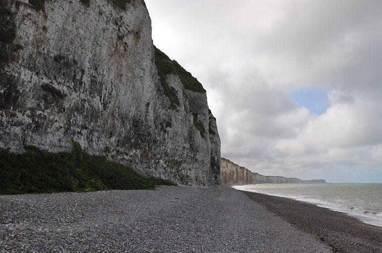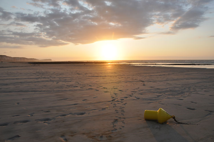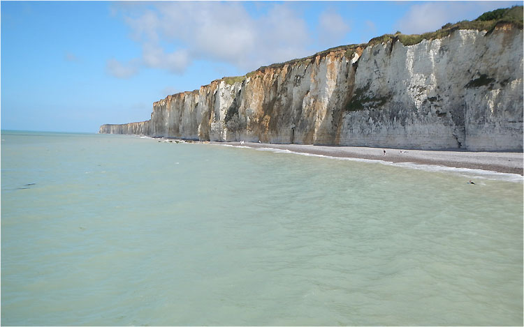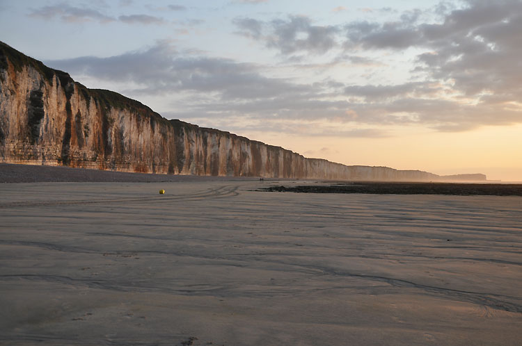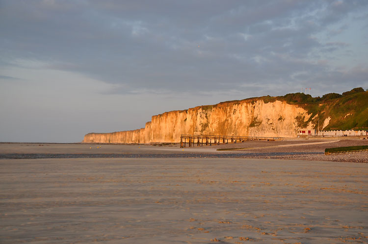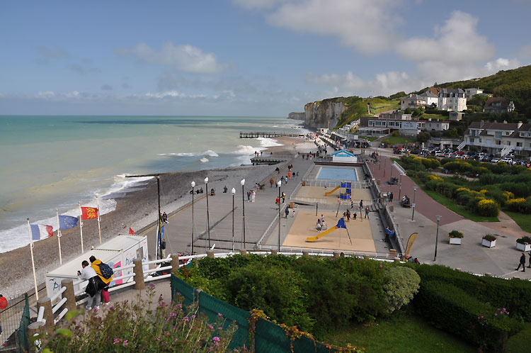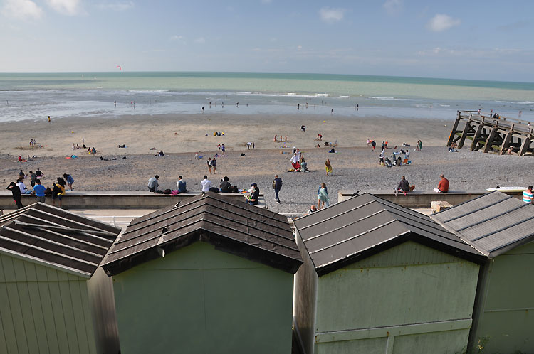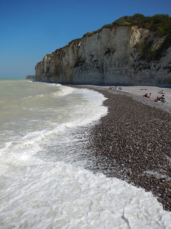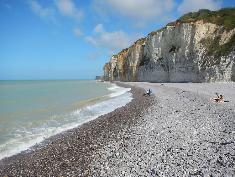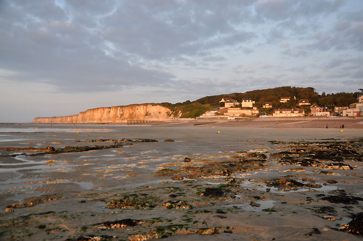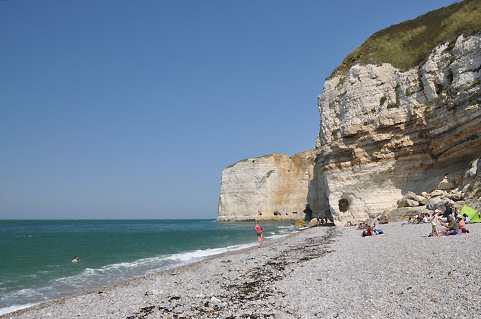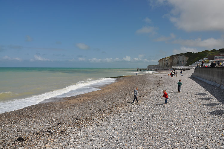 Die Strände hier sind leider Kiesstrände, erst bei voller Ebbe hat man auch sandige Bereiche, die dann aber natürlich nass sind. Wer unbedingt weite Sandstrände braucht, sollte besser nach Trouville oder Deauville fahren (südlich von Le Havre). Ansonsten sind Schwimmschuhe hier sehr nützlich (und wer seine zuhaus lässt, muss sich halt zusammenreißen ...).