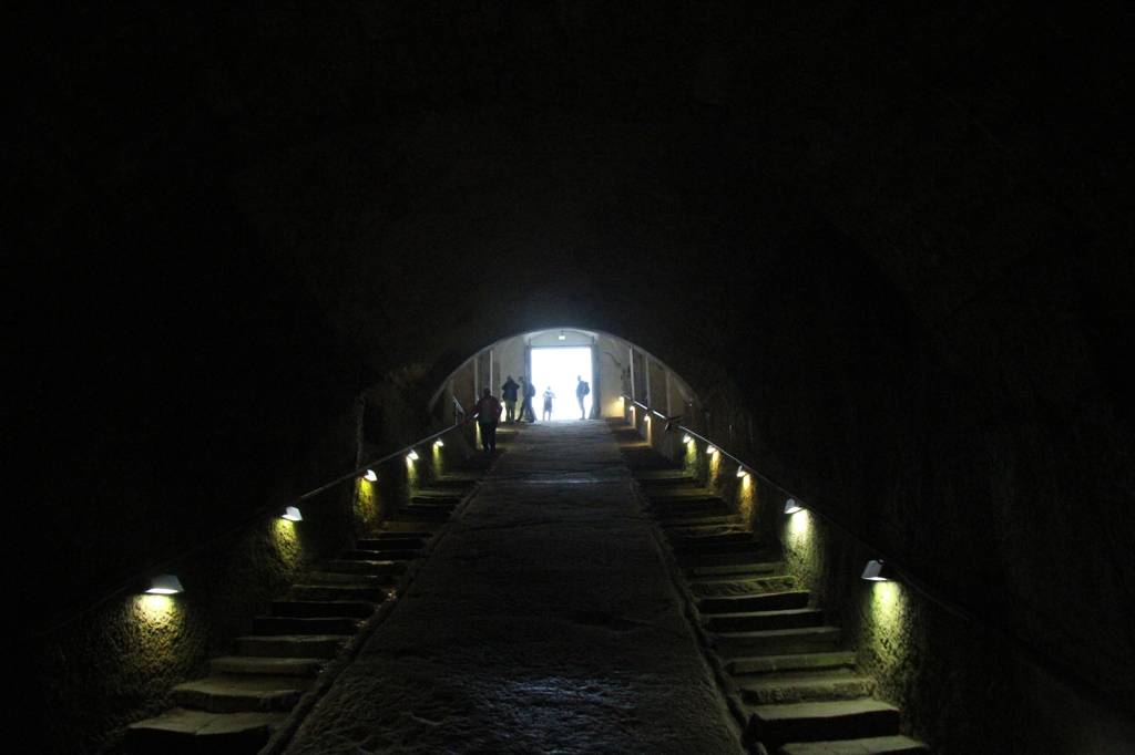 Einige Meter vor dem Ausgang geht rechts eine Treppe hoch, der wir folgen. Dort kommen wir zu einem anderen Eingang und einer weiteren Treppe, die wir hoch gehen, auch wenn davor ein Schild "Ausgang" steht.