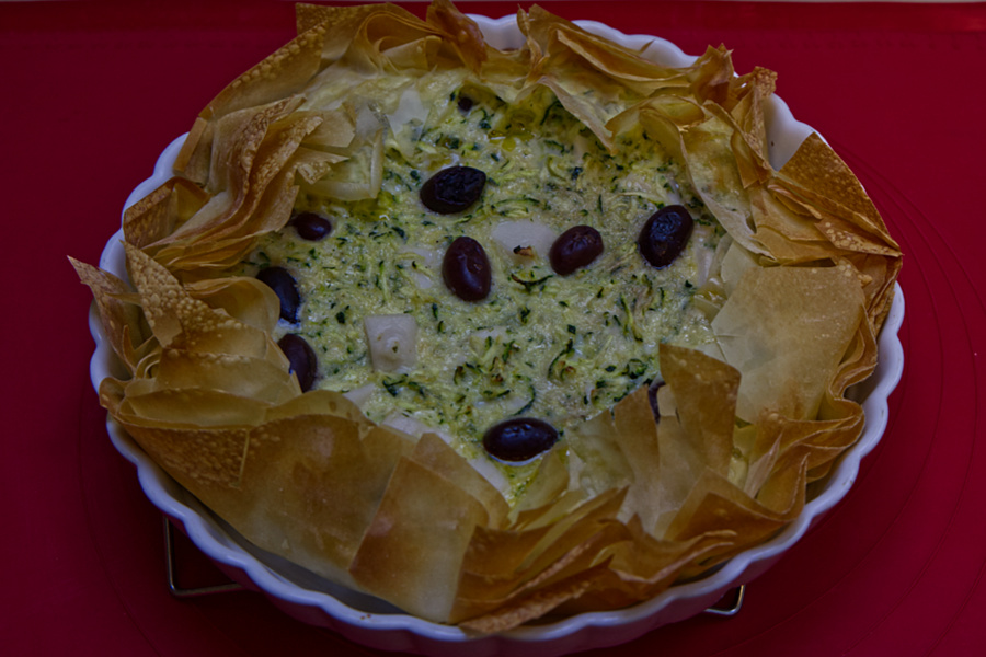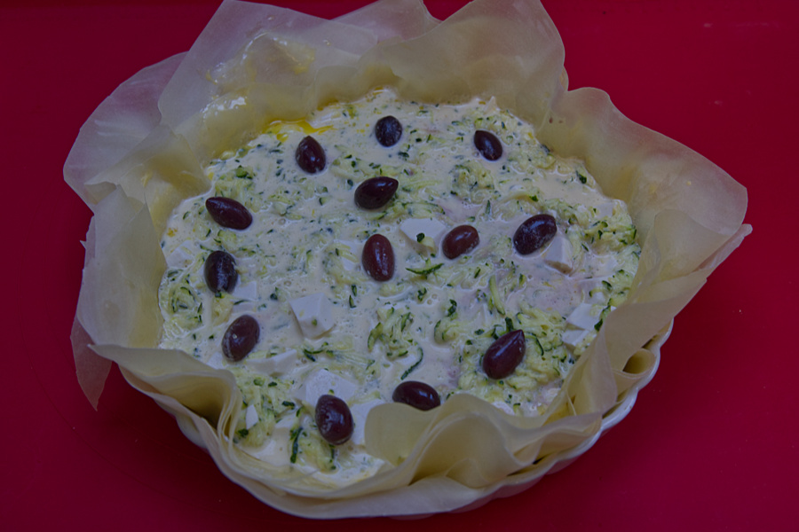 mit Strudelteigblätter (Filo - oder Yufkateig), Zucchini, Eier, Sahne, Margarine (Butter), Feta , Oliven, Pfeffer und Salz