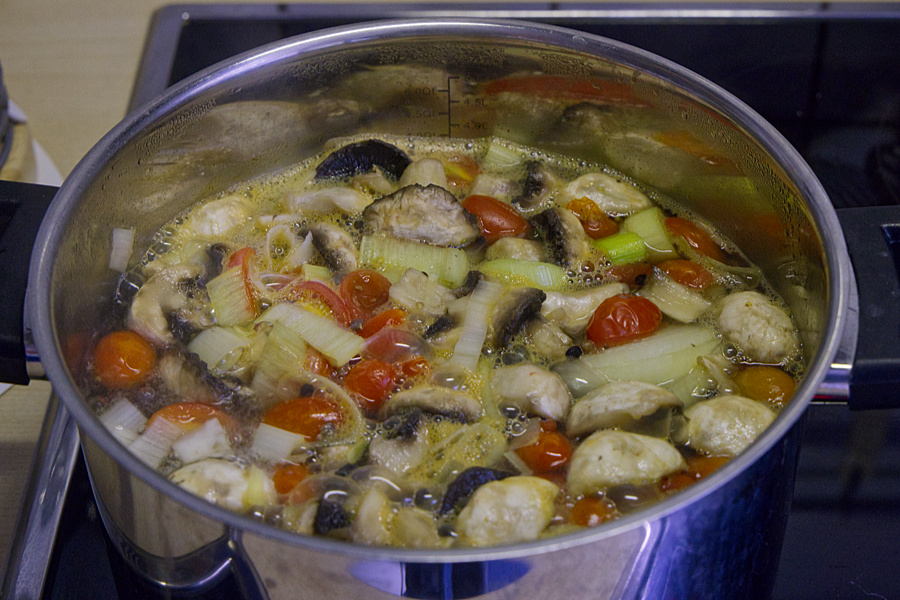 Gemüsezwiebel, Knoblauch, Suppengrün (Lauch, Möhren, Sellerie, Peterslienwurzel), Champignons, Kirschtomaten, Salz, Pfeffer, Lobeerblätter, Ingwer und Zimt