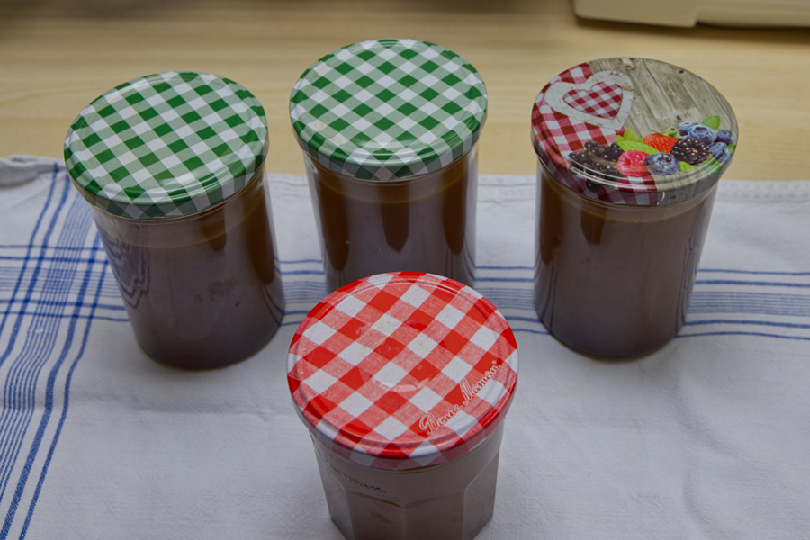Den Zimt habe ich schon nach kurzer Zeit wieder entfernt, das schmeckte mir zu intensiv. Beim nächsten Versuch werde ich auch den Ingwer weglassen. Auch diese Geschmacksrichtung liegt mir nicht so sehr. Nach dem Kochen habe ich alles durch ein Sieb gegossen und in Schraubgläser gefüllt, die ich vorher sterilisiert habe.