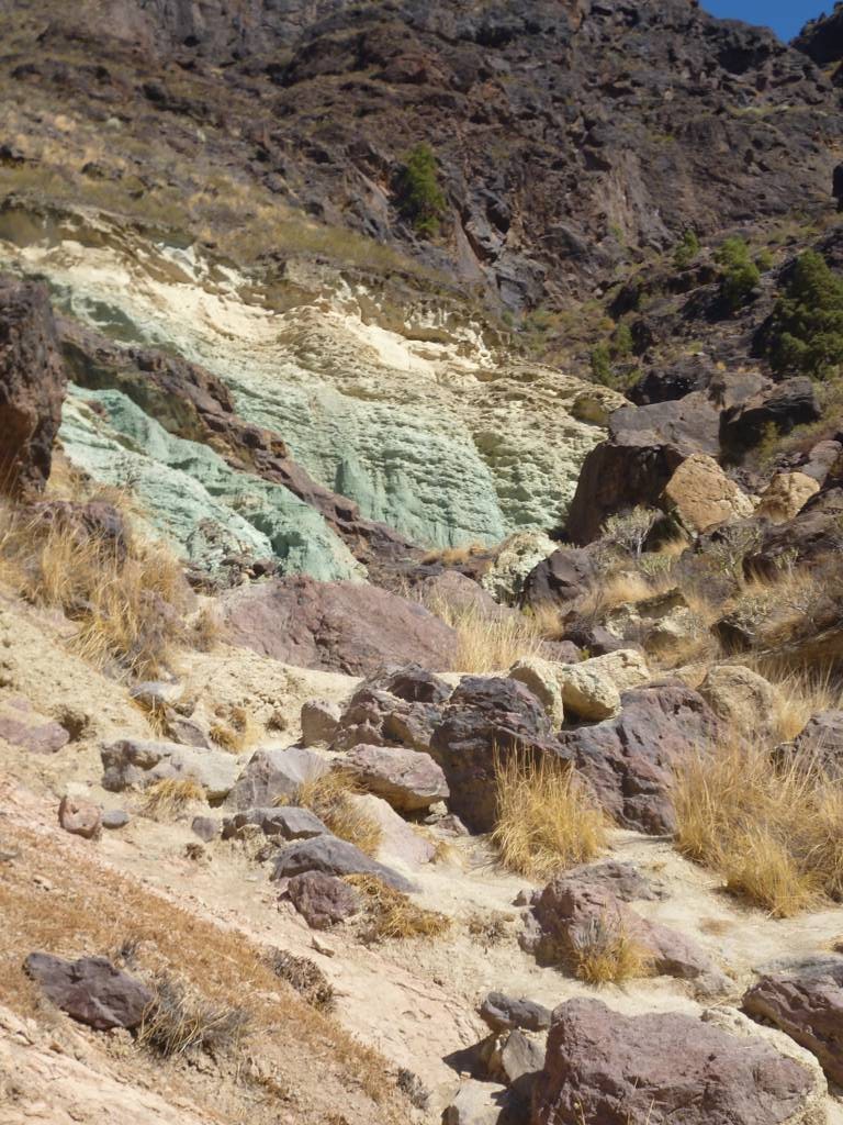 In den Reise stehen übrigens andere Erklärungen: So steht im Reiseführer vom Michael Müller Verlag, Gran Canaria auf Seite 211: "Die Färbung entstand, als aus einer Quelle stammendes Eisenhydrat an der Luft oxidierte."