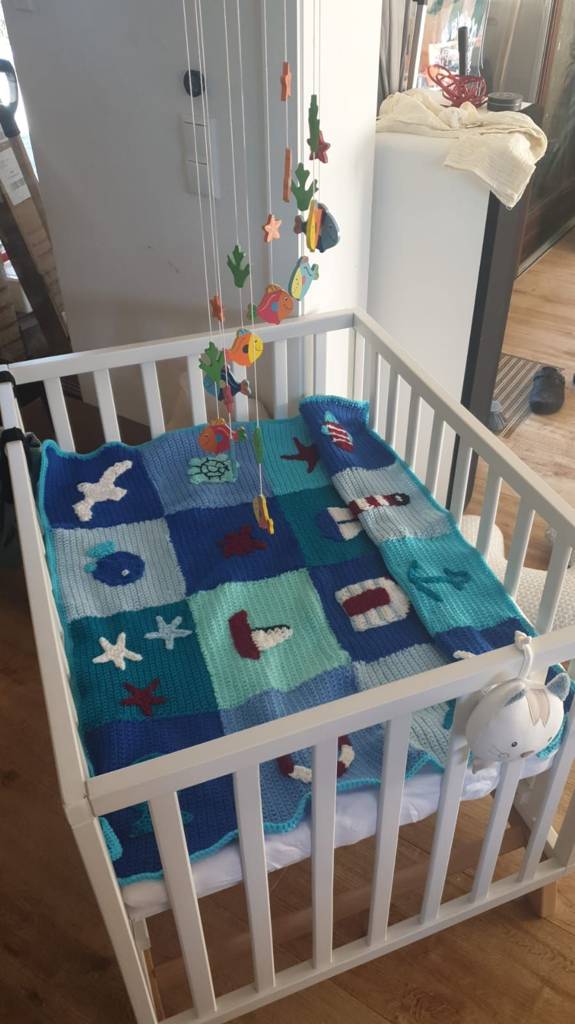 Meine Schwager wurde wieder Großvater und da dachte ich mir, dass ich für sein Enkelkind mal wieder eine Babydecke häkel. Eigentlich wollte ich die hier bereits bekannte Decke noch ein weiteres Mal häkeln, aber dann habe ich mich für ein neues Probjekt entschieden - ich habe eine grobe Vorlage ohne konkrete Anleitung, die ich abwandel,.