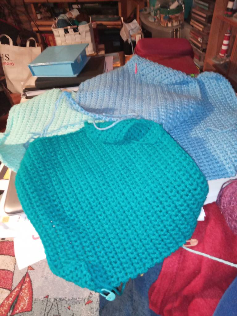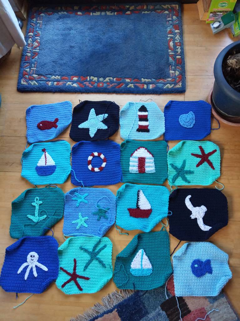 Ich häkel 16 Stücke mit 34 Maschen breite und ich glaube 36 oder 38 Reihen Höhe in verschiedenen Blautönen.