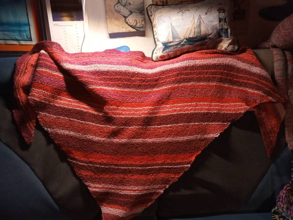 Heute hat eine Freundin Geburtstag und so habe ich am letzten Wochenende dieses Tuch angenadelt. Die Wolle nennt sich Silkwool und besteht aus 75 Prozent Wolle und 25 Prozent Seide. SIe ist leider sehr dünn, aber auch sehr leicht. Das Tuch scheint fast nichts zu wiegen. Nadelstärke 2,5. Es ist in rechten Maschen gestrickt - die Zunahmen habe ich nach Gutdünken vorgenommen, mal in jeder zweiten Reihe auf jeder Seite eine Masche dazu, mal aber auch in drei Reihen hintereinander diese Zunahme und die 4 Reihe dann nicht. Anleitung gibt es ansonsten nicht, braucht man dafür auch nicht.