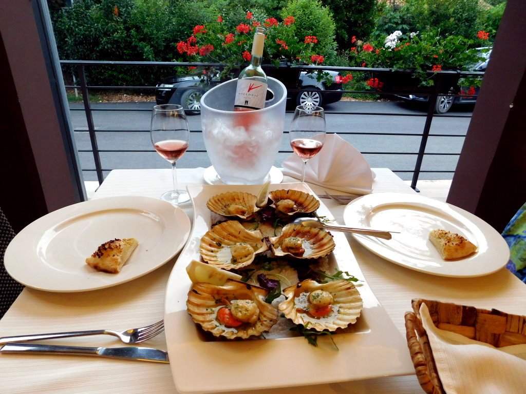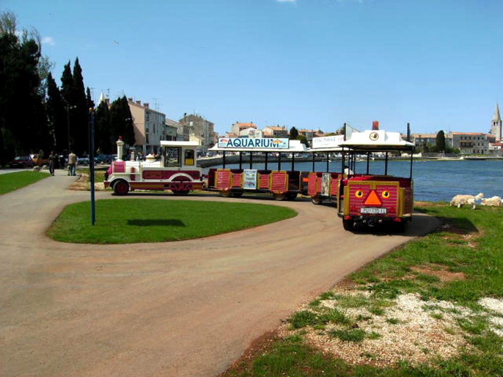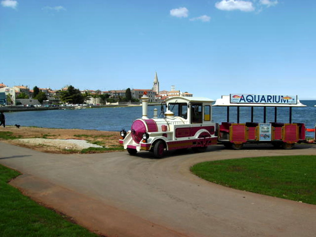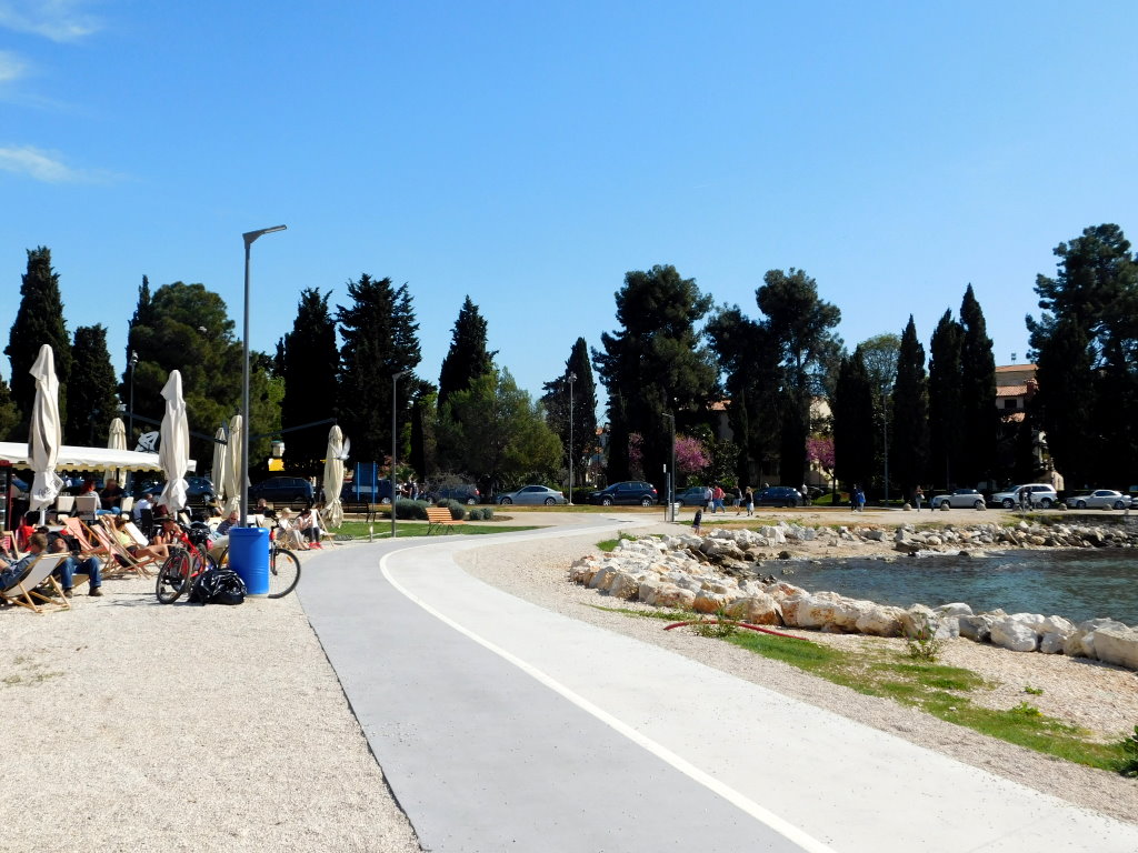 Wir laufen also an der Nicole Tesle los entlang der Peškera-Bucht und kommen zum großen Platz, wo die Endhaltestelle der Bimmelbahn nach Spadići ist. Dort ist auch eine hübsche Lounge-Bar. Man hat dort einen schönen Blick auf das Panorama der Altstadt mit der Stadtmauer, der Eufrazijeva Basilika und aufs Meer hinaus. Abends kann man dort einen wunderschönen Sonnenuntergang genießen.