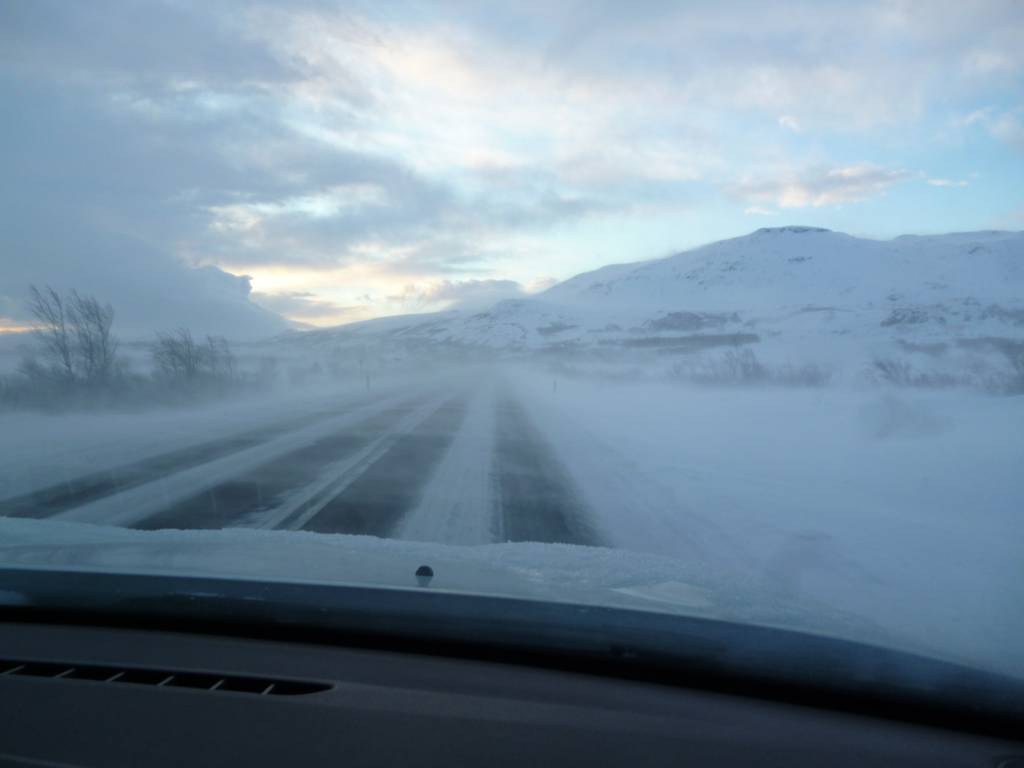 Auf der Rückfahrt muss unser Autofahrer wieder mit starkem Wind und Schneeverwehungen kämpfen- Es ist manchmal schon echt fies