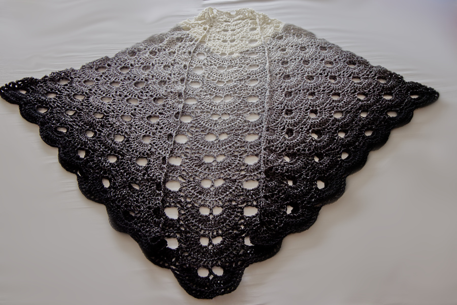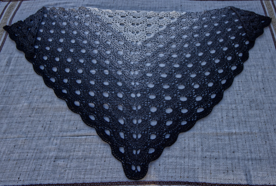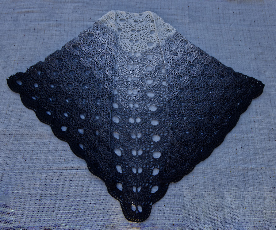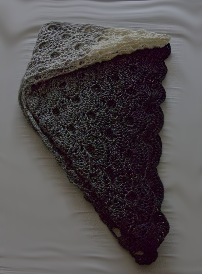 Es ist ein Grauverlauf und fängt mit weiß an und hört mit schwarz auf, oder umgekehrt, je nachdem, mit welchem Ende man anfängt. Von diesem Bobbel habe ich ein paar Reihen mehr geschafft. Ach so, es ist Baumwolle und keine Wolle. Ursprünglich wollte ich lieber Wolle haben, aber diesen Farbverlauf gab es nicht.
