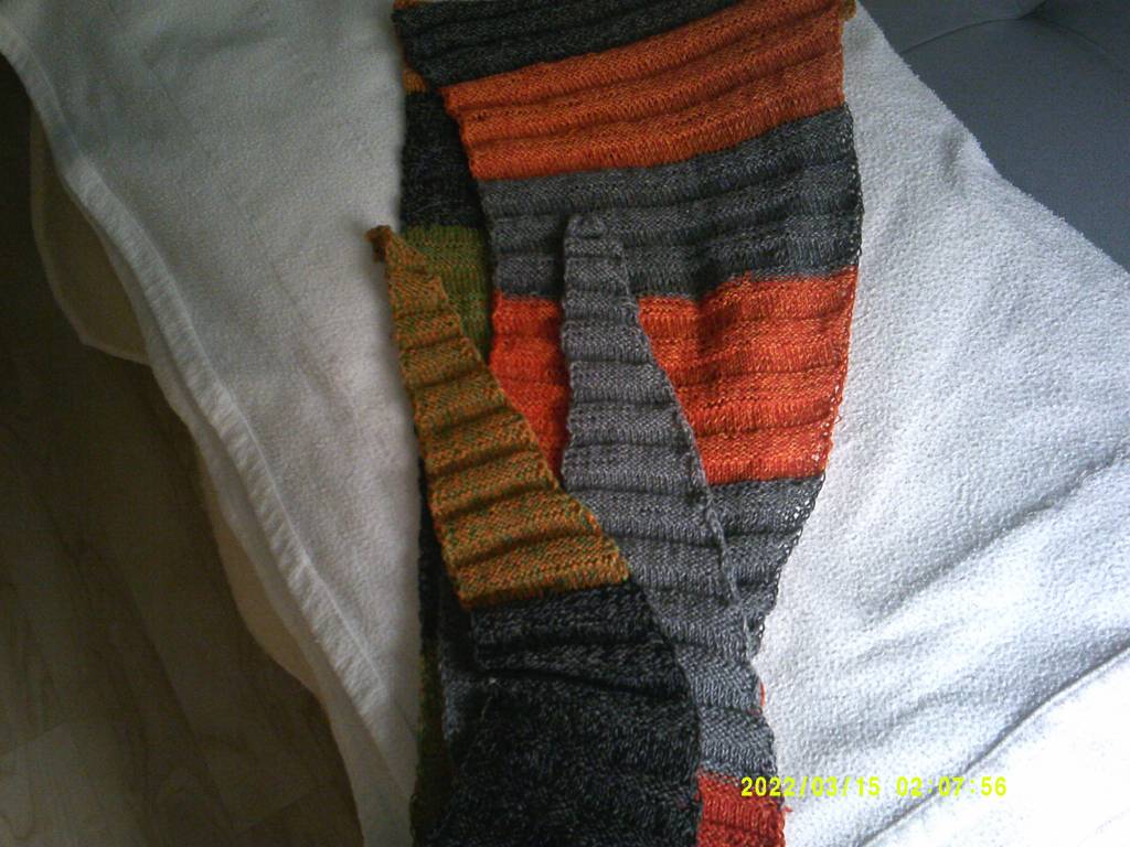 Das ist wirklich eine interessante Idee mit den spitz zugehenden Enden. Das Muster sieht auch gut aus. Hast Du immer einige Reihen links und dann einige Reihen rechts gestrickt?