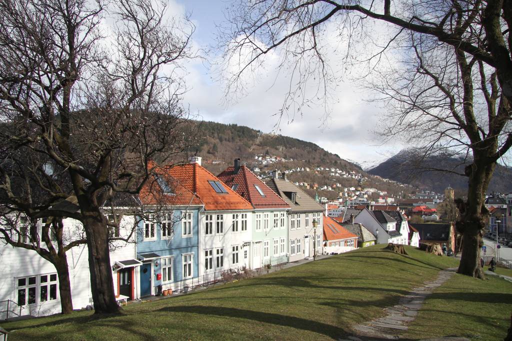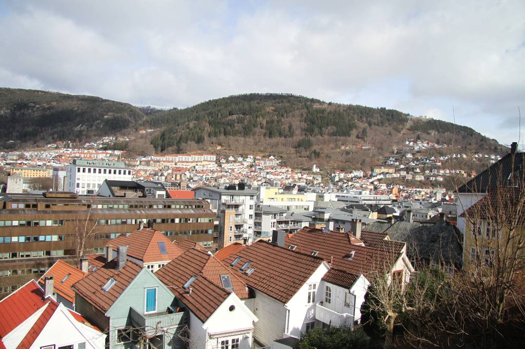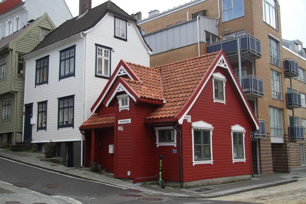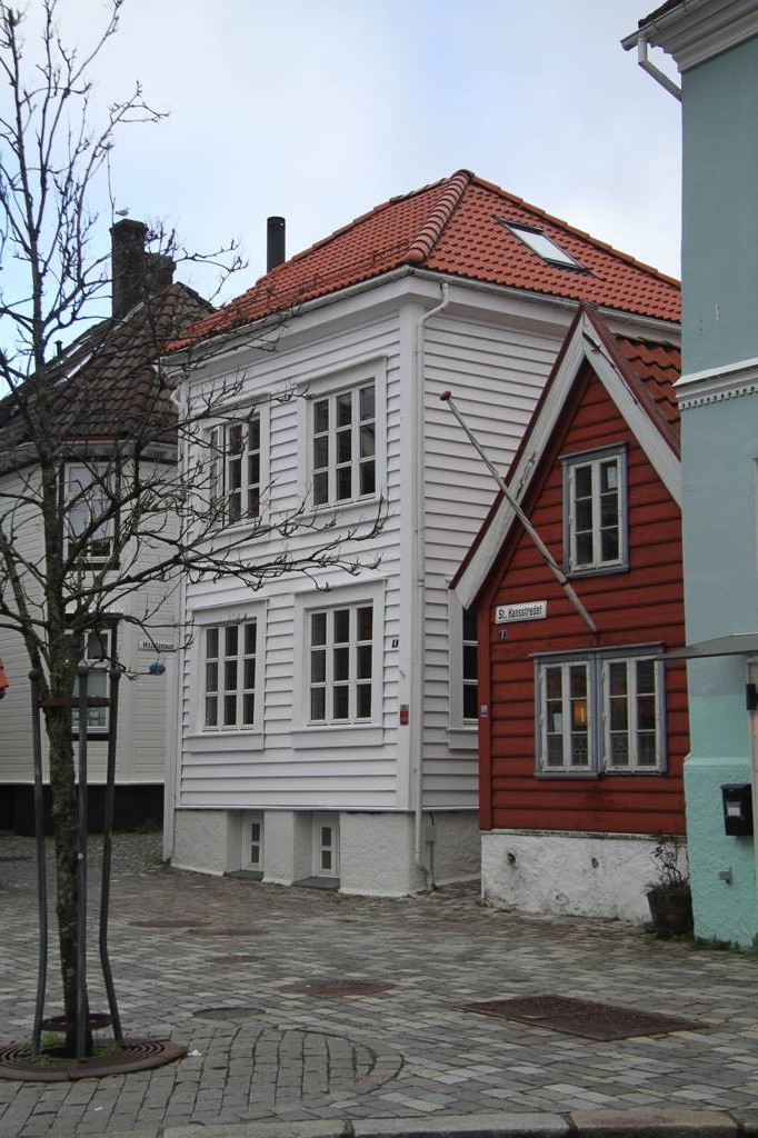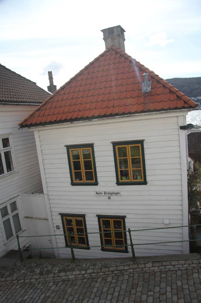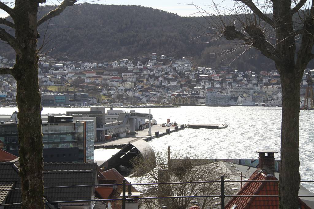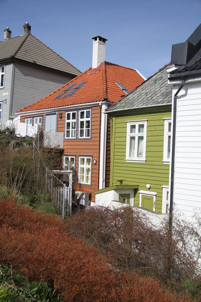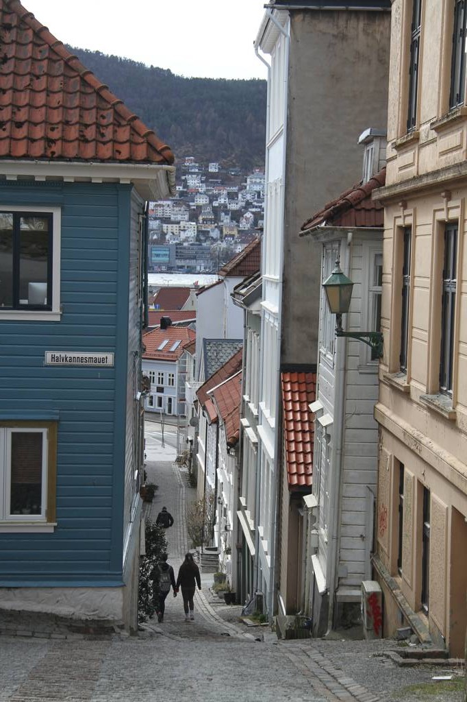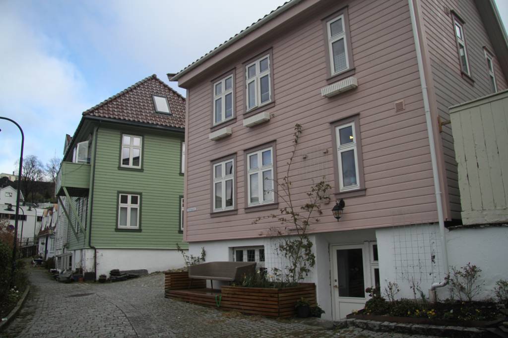 Wir sind hier auf einer Art Landzunge, wo links und rechts Wasser ist - linkerhand ist der Bereich, wo die Hurtigrute abfährt, rechts der Bereich, auf dessen andere Seite Bryggen liegt. Unsere Unterkunft ist nach links ausgerichte,t aber zur rechten Seite gibt es auch noch etliche von den schönen Holzhäusern. In der MItte geht es steil nach oben und da ist ein kleiner Spielplatz, von dem wir uns eine gute Aussicht erhoffen
