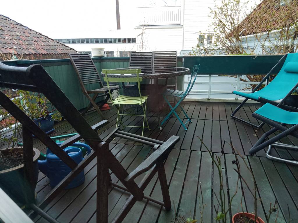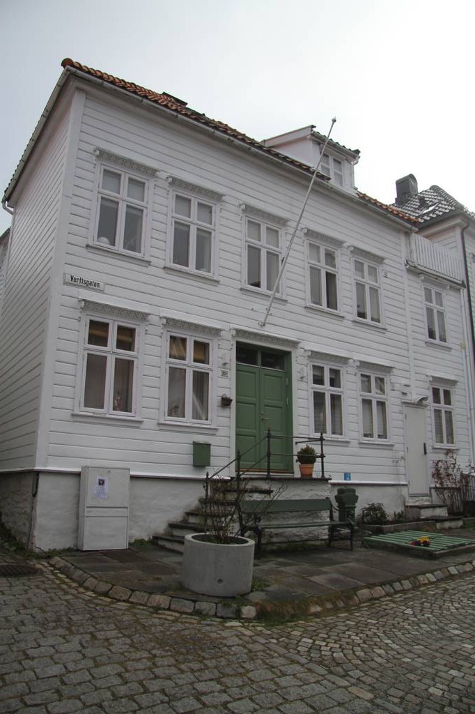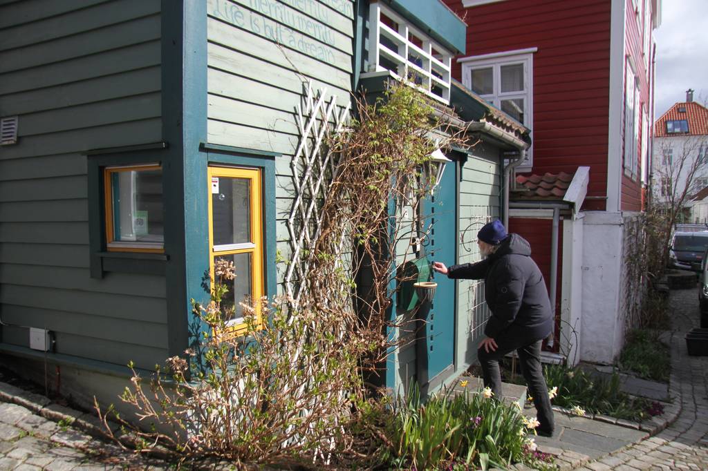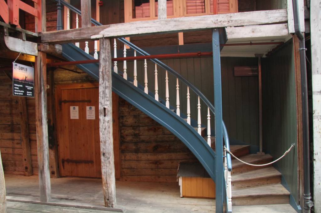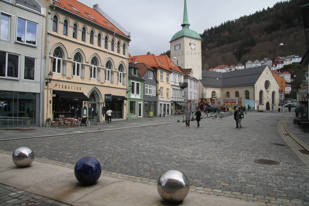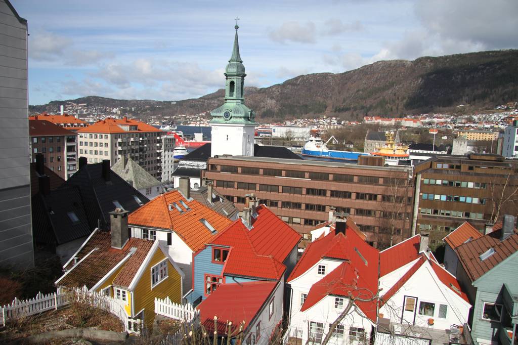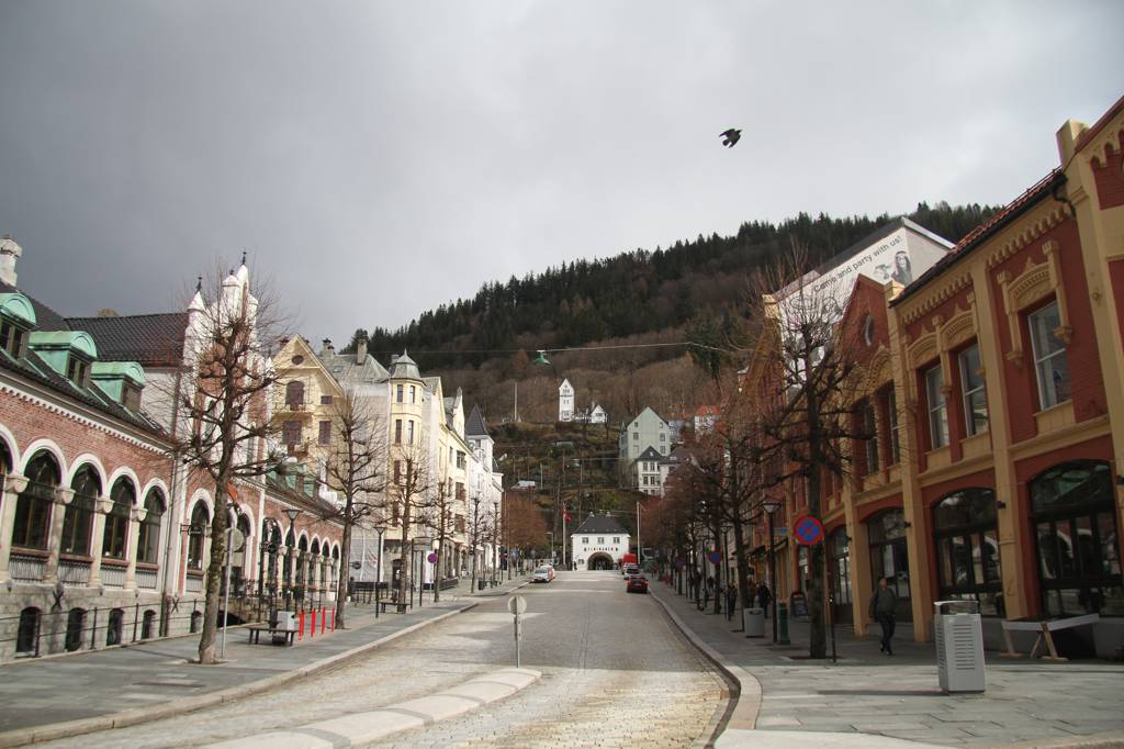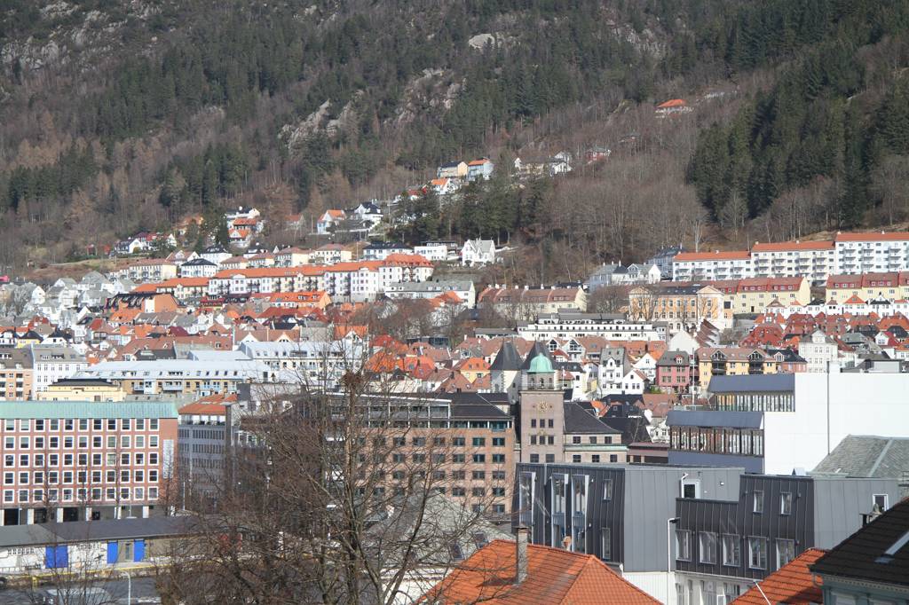 Wir sind hier auf einer Art Landzunge, wo links und rechts Wasser ist - linkerhand ist der Bereich, wo die Hurtigrute abfährt, rechts der Bereich, auf dessen andere Seite Bryggen liegt. Unsere Unterkunft ist nach links ausgerichte,t aber zur rechten Seite gibt es auch noch etliche von den schönen Holzhäusern. In der MItte geht es steil nach oben und da ist ein kleiner Spielplatz, von dem wir uns eine gute Aussicht erhoffen