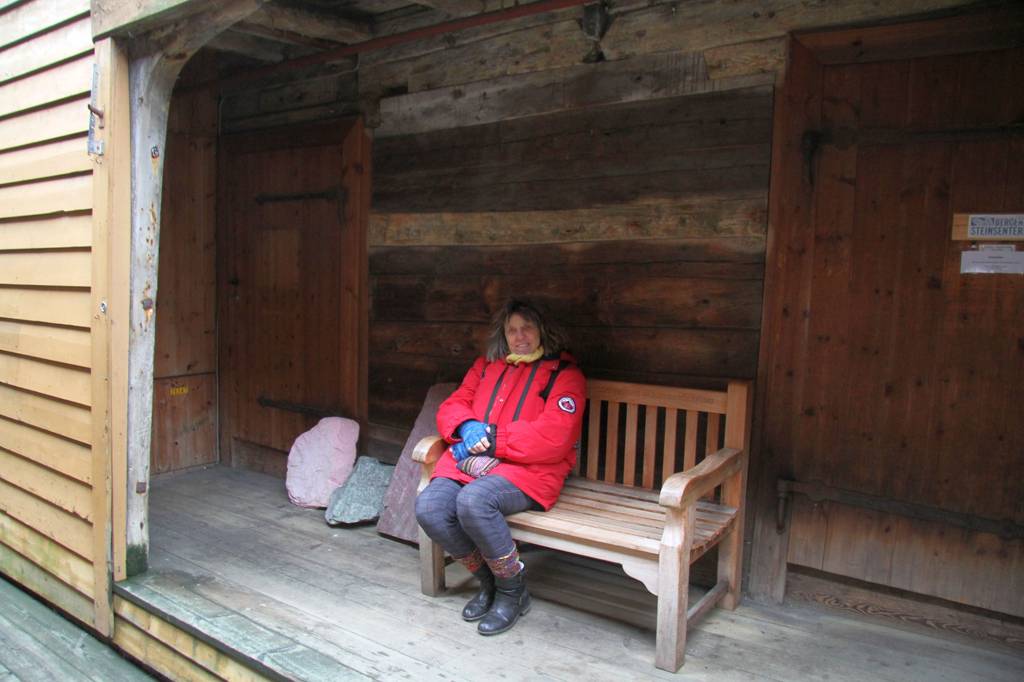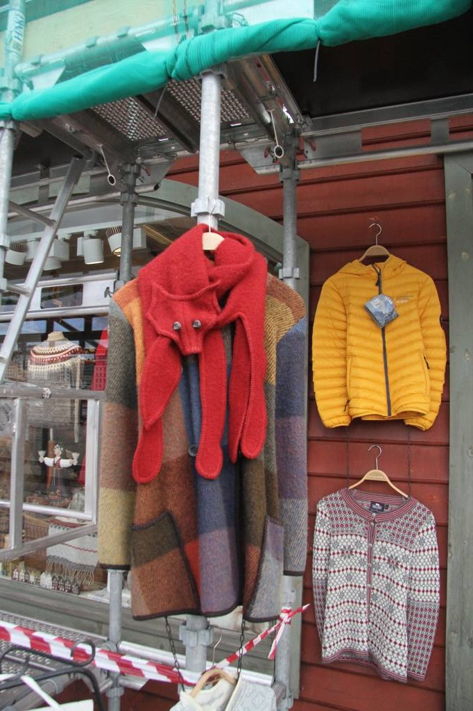 In den alten Speicherhäusen finden sich viele Läden mit Wollsachen und allen möglichen ANdenken. Diese Jacke finde ich toll, der gefilzte Schal gefällt mir auch. Draußen findet sich kein Preis, drinnen im Laden ja - oh nur 995 Kronen? Das ist eine Überlegung werde... dann entdecke ich, dass das Preisschild an einem Schal, der über der Jacke hängt, befestigt ist. Die Jacke kostetn 2995 NOK - 300 Euro, da bin ich raus. Aber vielleicht eine Idee zum selbermachen