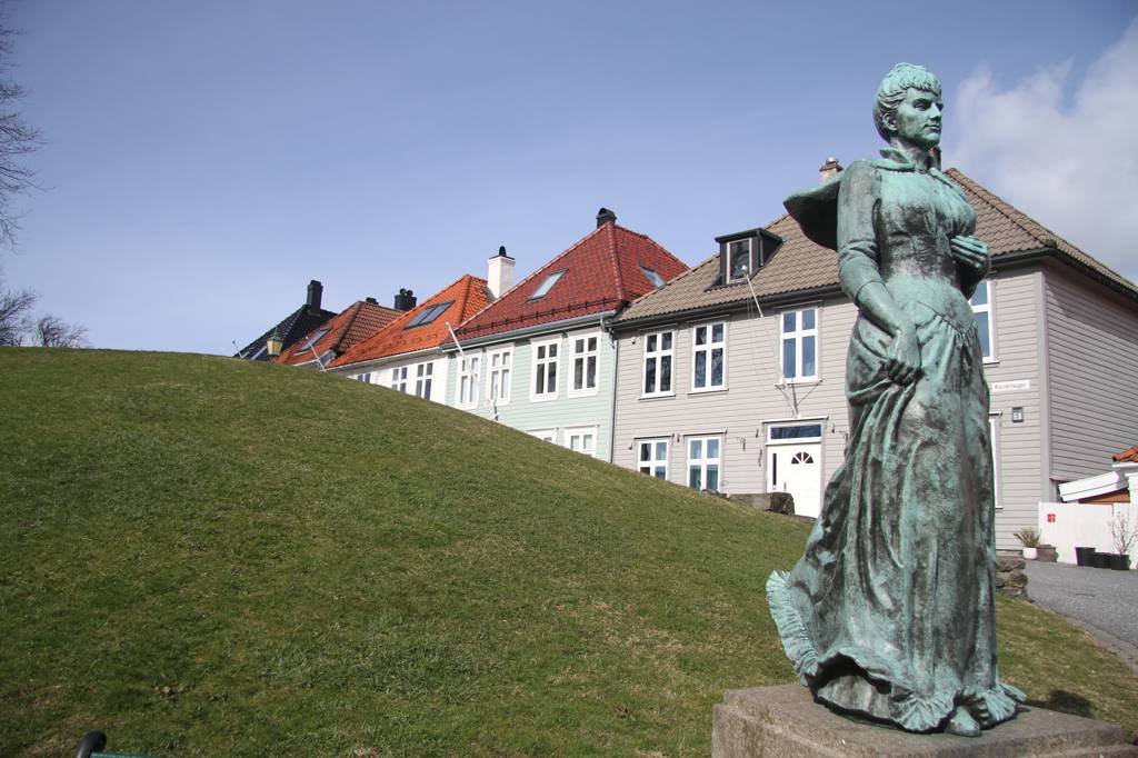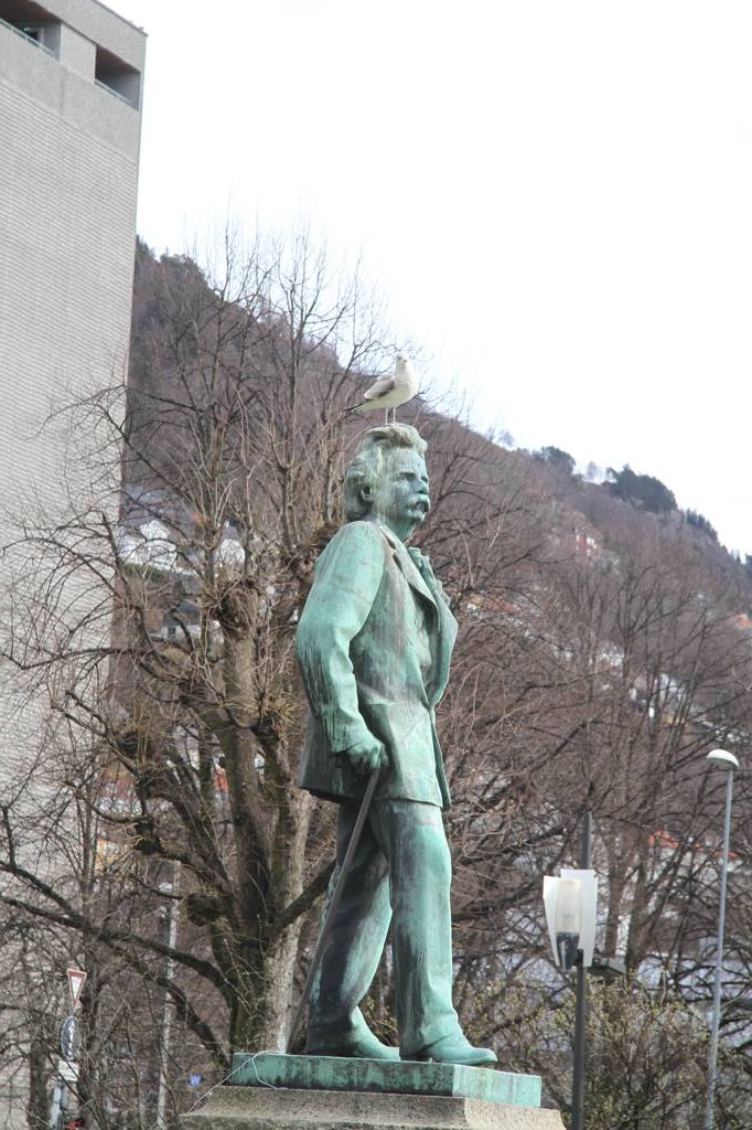 Wir gehen weiter zur Endhaltestation der Stadtbahn, denn da gibt es einen kleinen Park und auch einen kleinen See. Im Park steht Edward Grieg, dem gerade eine Möwe auf den Kopf gestiegen ist. Die Sonne scheint und ein Musiker spielt Akkordion. Wir setzen uns auf eine Bank und pausieren
