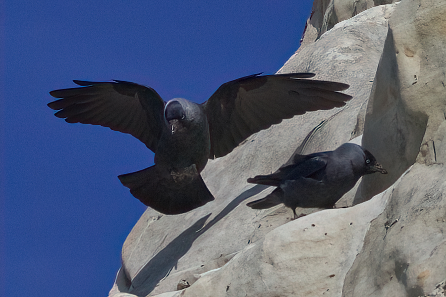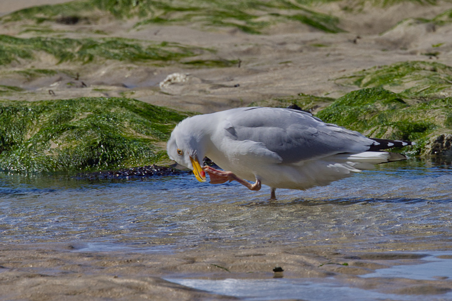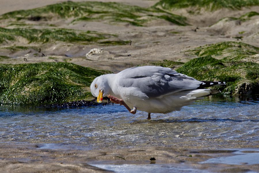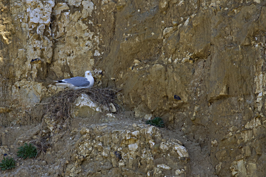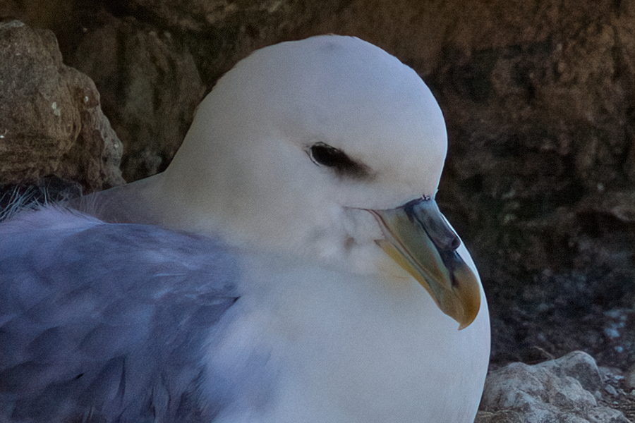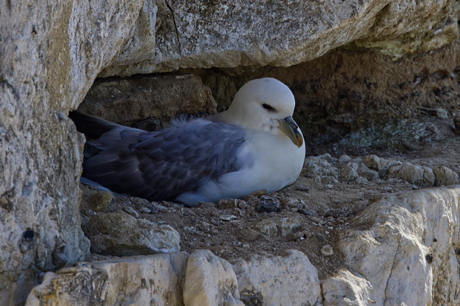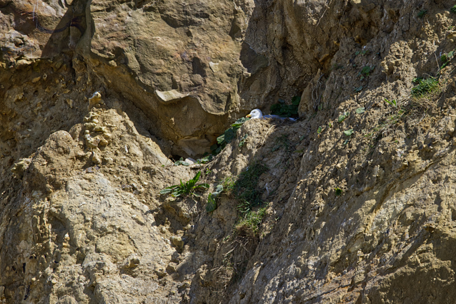 Wir packen zusammen und gehen langsam zurück, denn das Wasser kommt näher. Zwischendurch muss ich auf dem Podest etwas verschnaufen. Es kommt eine Wandergruppe, die lassen wir vorbei. Ich hole meinen Fotoapparat wieder raus, denn ich entdecke in der Steilwand auf der rechten Seite Vögel. Beim näheren Hinsehen erkenne ich sie. Es sind Eissturmvögel, die hier brüten.