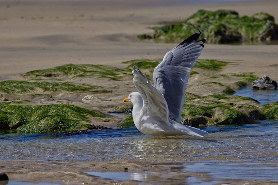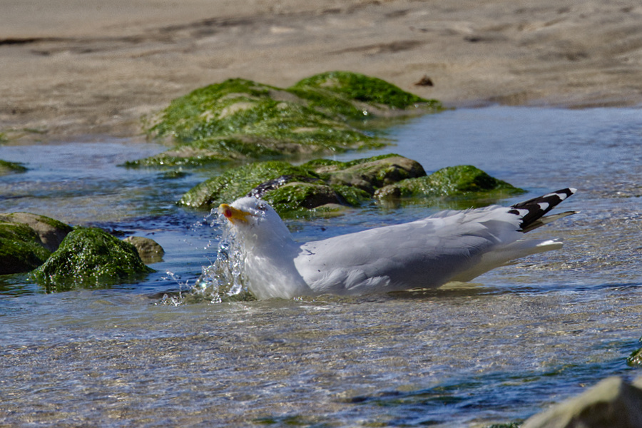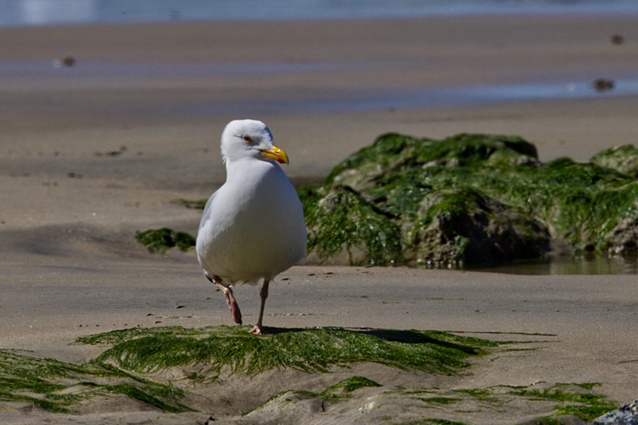 Eine schöne Ecke! Wir gehen die Stufen wieder hinunter trinken ein Tonicwasser und machen noch einen kleinen Spaziergang unten am Strand. Hier treffen wir dann auch mal den ein oder anderen Touristen. Man sieht, es ist schon wieder Ebbe und sehr windig aber angenehm warm. Der Wind weht einen Hut ins Wasser. Die Besatzung des Segelschiffes schafft es, diesen wieder rauszufischen.
