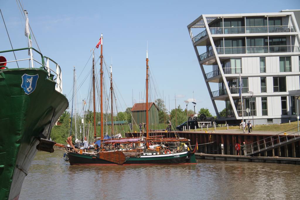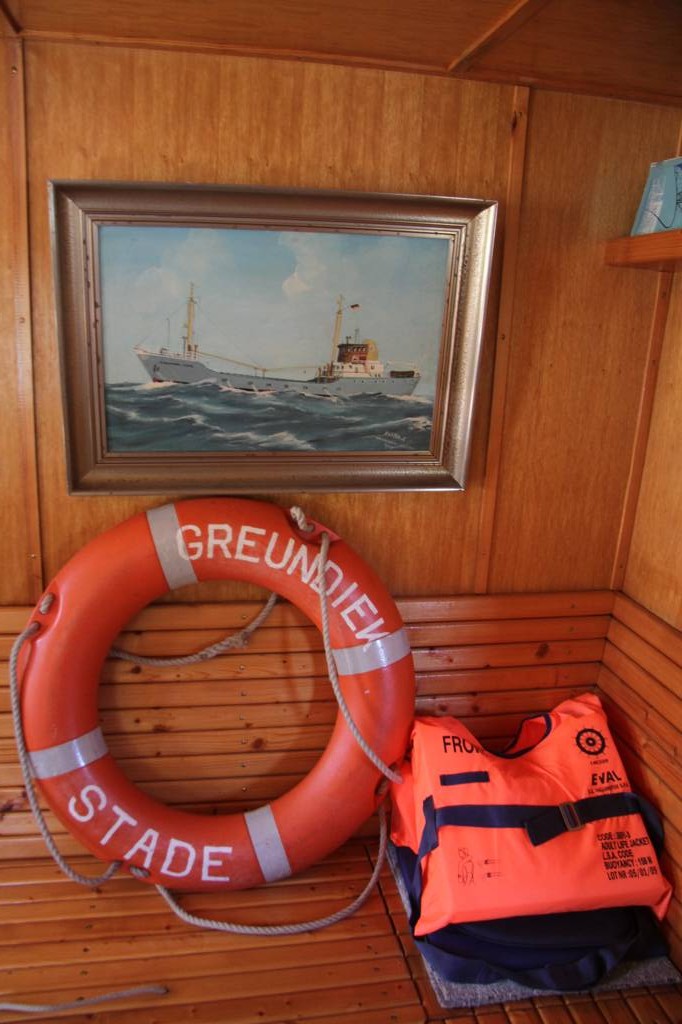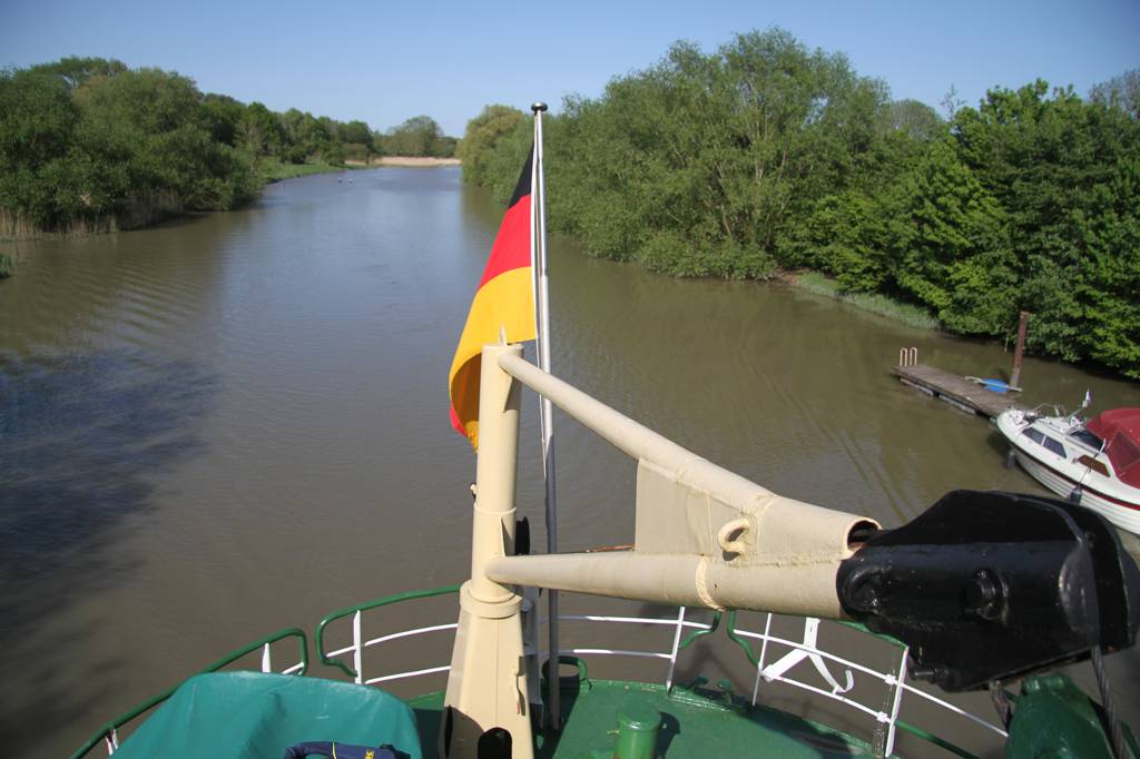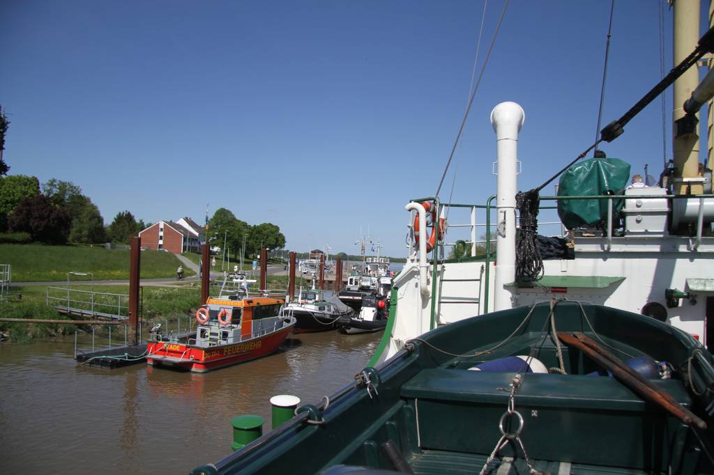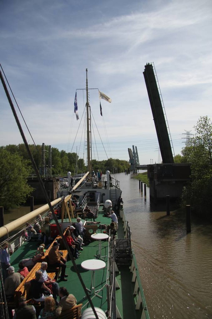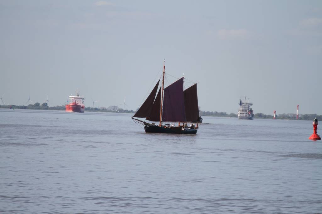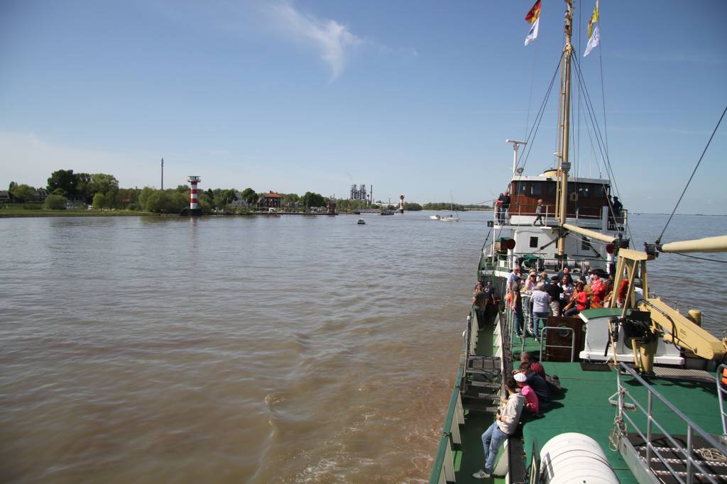 Glücklicherweise erwarb der Verein Alter Hafen Stade e. V. das Schiff 1994, restaurierte es und es bekam seinen Liegeplatz im Hafen von Stade, wo wir nun losfahren auf unsere Bootstour bei fantastischem Wetter