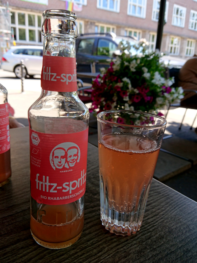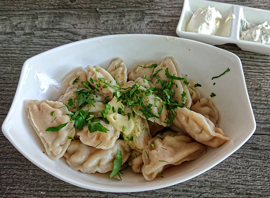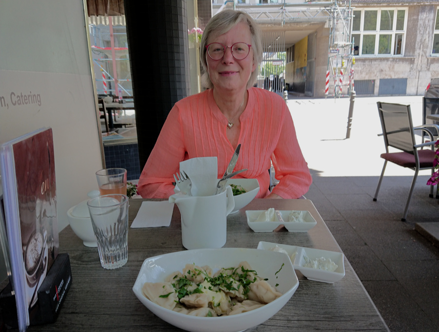 Danach haben wir einen Spaziergang gemacht und sind zum Café ViLena gegangen. Dort gab es eine Rhabarberschorle und Wareniki, ein russisches Gericht: gekochte handgemachte Teigtaschen, gefüllt mit Kartoffelbrei und leicht gerösteten Zwiebeln und zweierlei Schmand, pappsatt waren wir und lecker war´s. Noch einen Cappucino und dann gingen wir in der Hitze zurück.