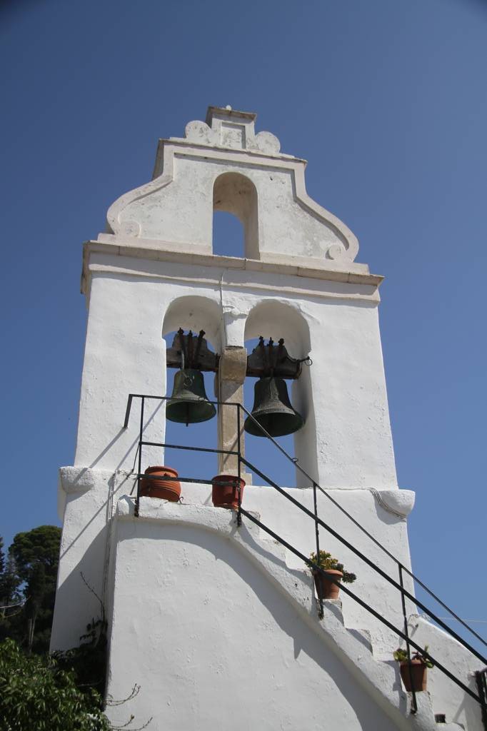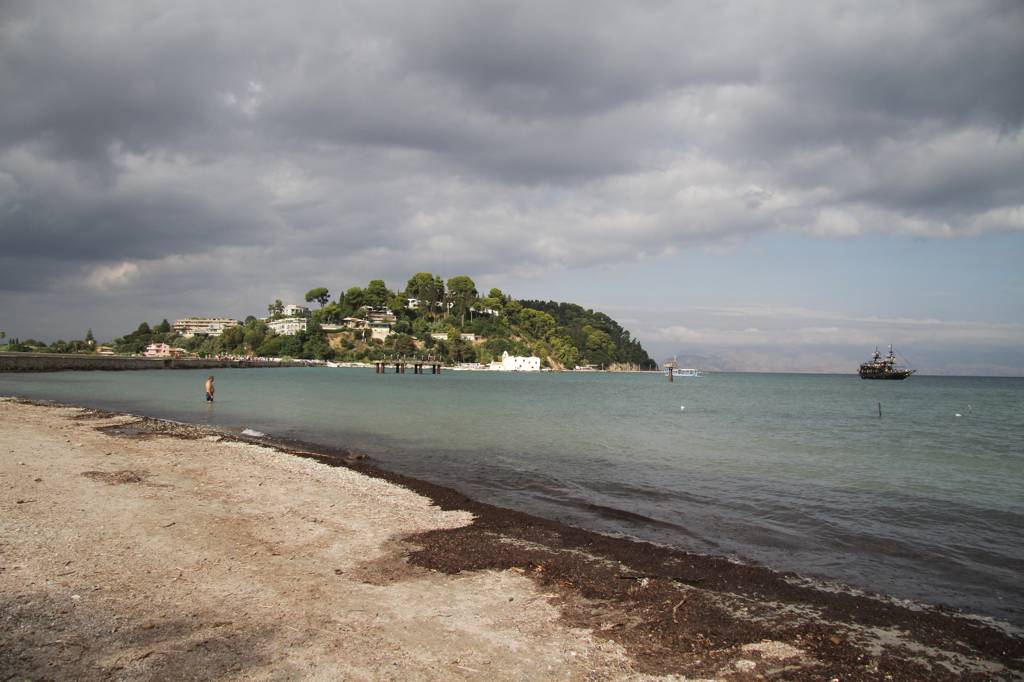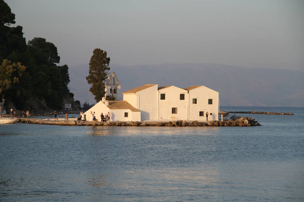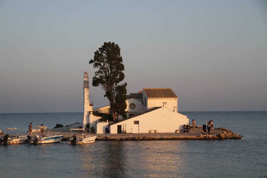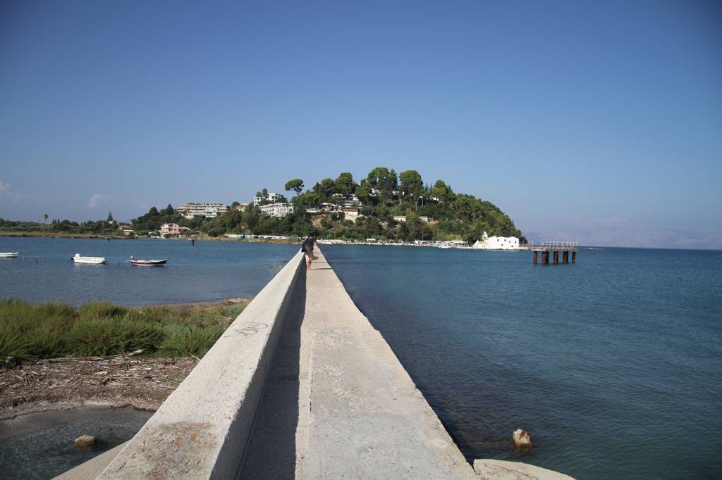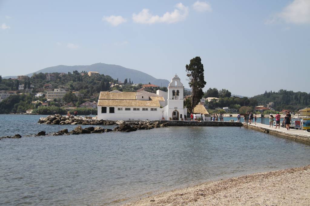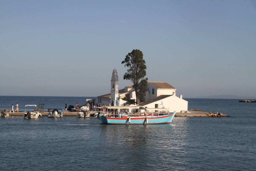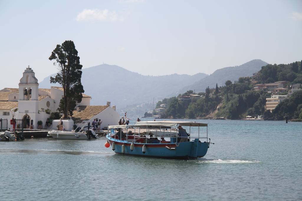 Wir wollen auf die sogenannte Mäuseinsel, Pondikonsi, fahren, also laufen wir zum kleinen Hafen, wo das Kloster liegt
