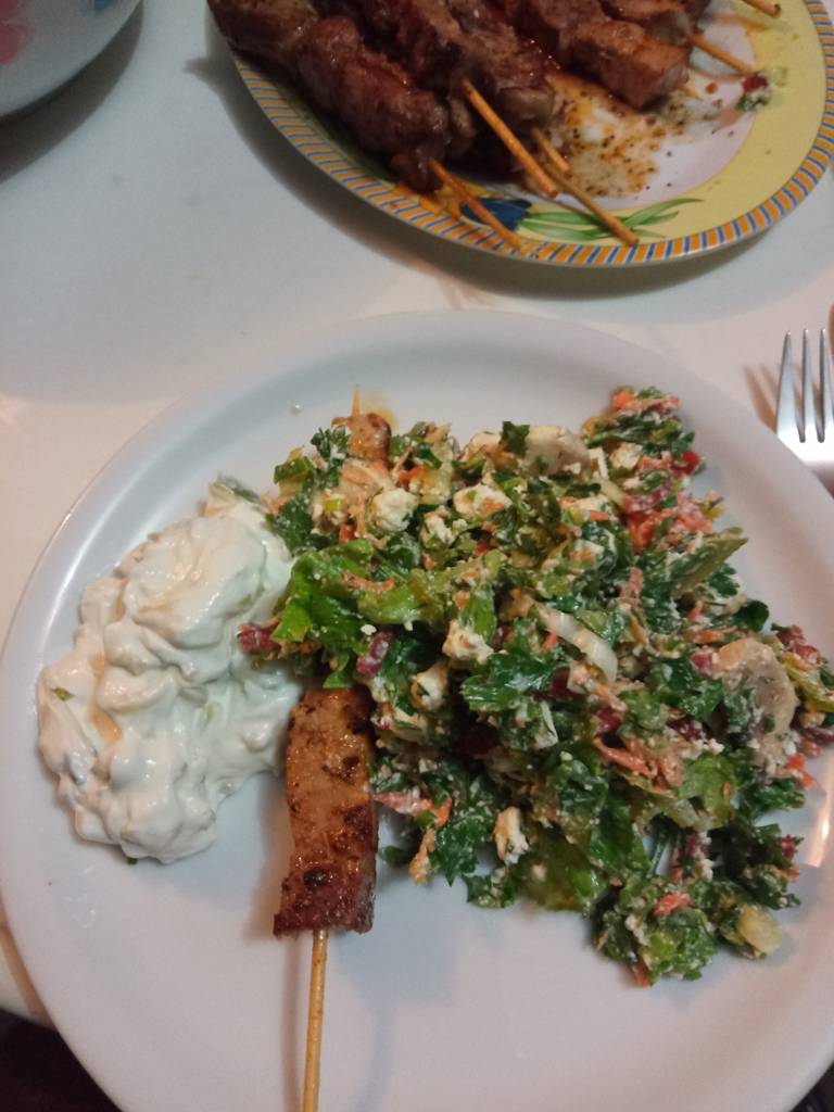 Heute gibt es lecker Spieße mit Salat und Tzazike - natürlich selbst gekocht.