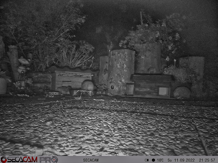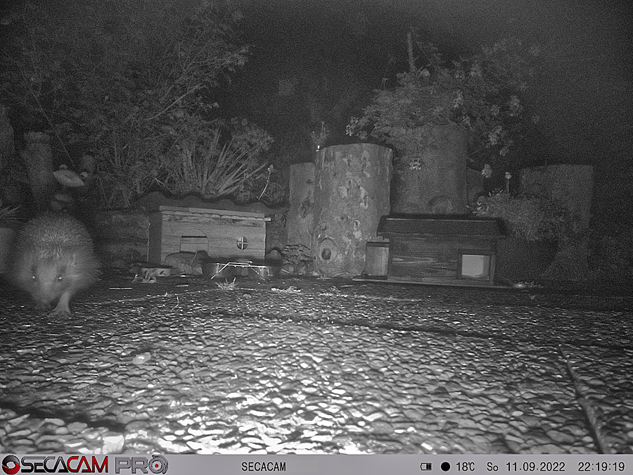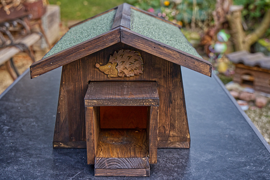 Ich habe das KIefernholz noch mit Holzschutzfarbe versehen. Nun ist es etwas dunkler geworden, aber das spielt keine Rolle. Dieses Häuschen hat einen Boden. Wir haben es auf eine größere Bodenfliese gestellt und waren nun gespannt, ob die Igel die 2. Futterstelle auch annehmen.