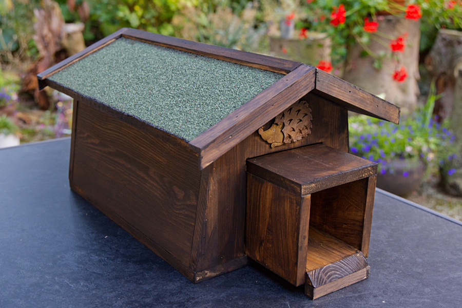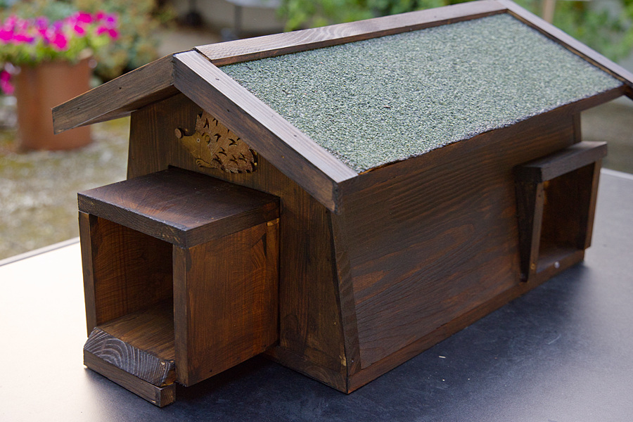 Das erste Häuschen war schon fertig zusammengebaut. Es hat 2 Eingänge mit einer Schleuse, so dass größere Tiere wie Katzen nicht hineinkommen. Das Dach hat einen Schutz aus Bitumen.