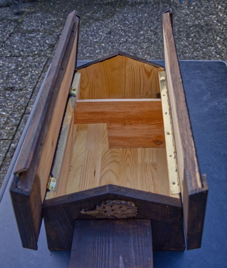 Es lässt sich aber nur auf einer Seite öffnen. So habe ich Friedrich gebeten, dass er die andere Dachhälfte auch mit einem Scharnier versieht.