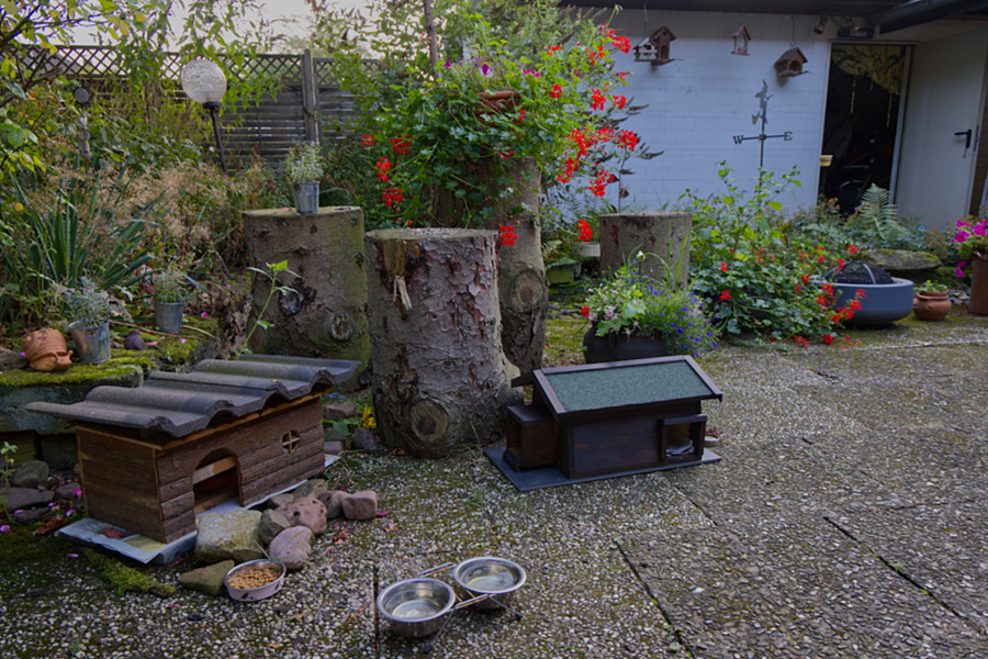 Die erste Futterstelle im letzten Bild links ist eigentlich ein Meerschweinchen-Haus, welches wir etwas umfunktioniert haben.