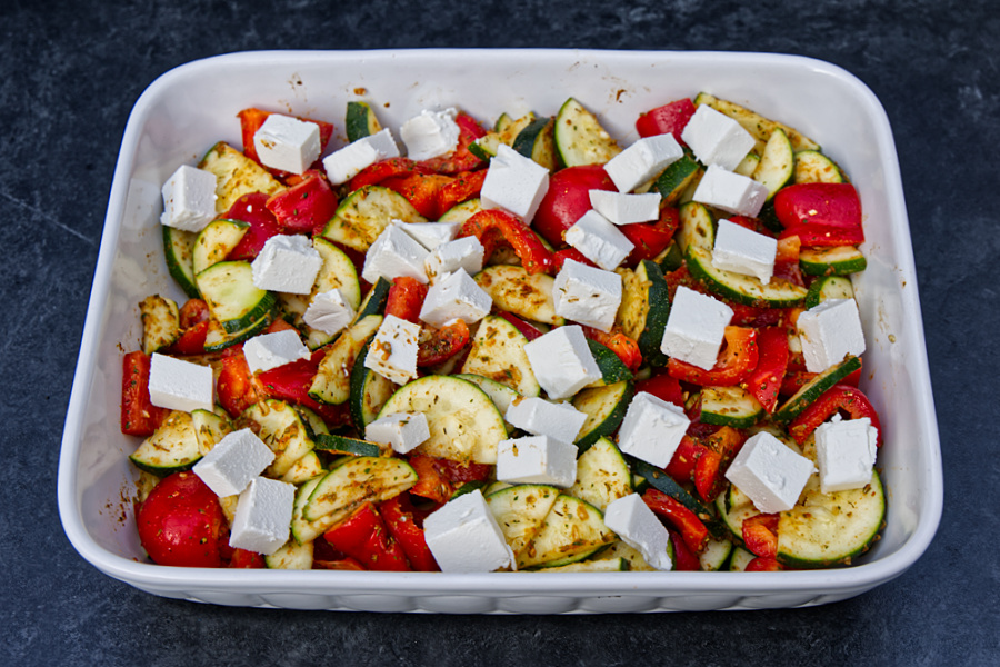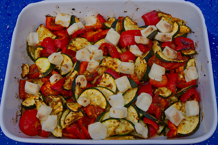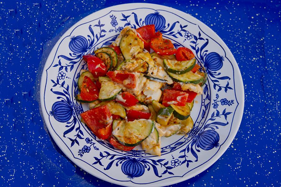 Somit kaufte ich noch 2 Zucchini und 3 rote Paprika. Das Gemüse habe ich klein geschnitten in eine Schüssel gefüllt, das Pulver der Tüte darüber gestreut, 4 Teelöffel feinstes Olivenöl darüber und alles gut vermischt.