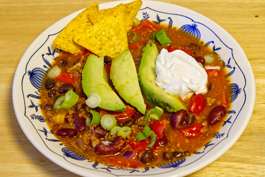 Heute habe ich wieder ein neues Rezept ausprobiert mit Zwiebeln, Knoblauch, Paprika, Veggi-Hack, schwarze Bohnen, Kidneybohnen, Tomaten-Chilisauce, Tomatenmark, Lauchzwiebel, Avocado, Zitronensaft und Tortillachips.