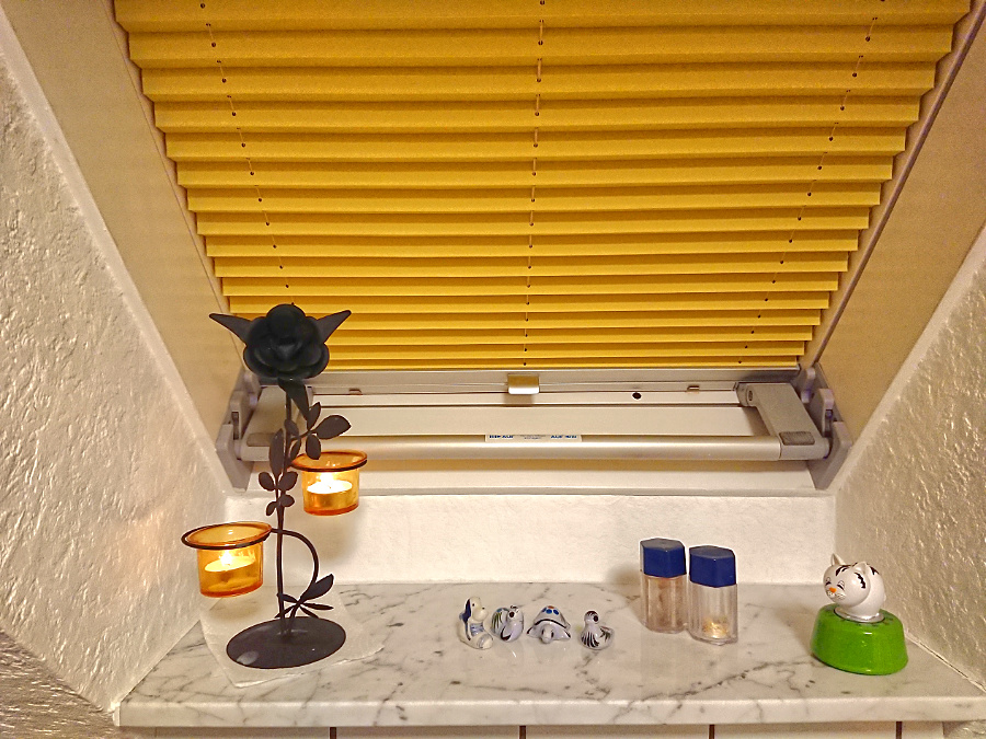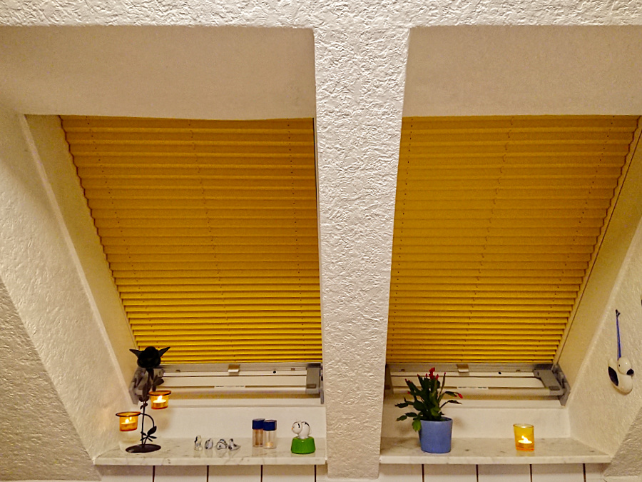 Schon vielen Jahrzehnten haben wir in unserer Küche 2 Braas-Dachfenster. Für diese Fenster gab es nur vom Hersteller spezielle Sichtschutze. Leider gibt es die Firma Braas nicht mehr und unsere Plissees an den Fenstern hatten ganz schön "Moder" angesetzt, denn sie waren wirklich schon sehr alt. Es musste was Neues her.
